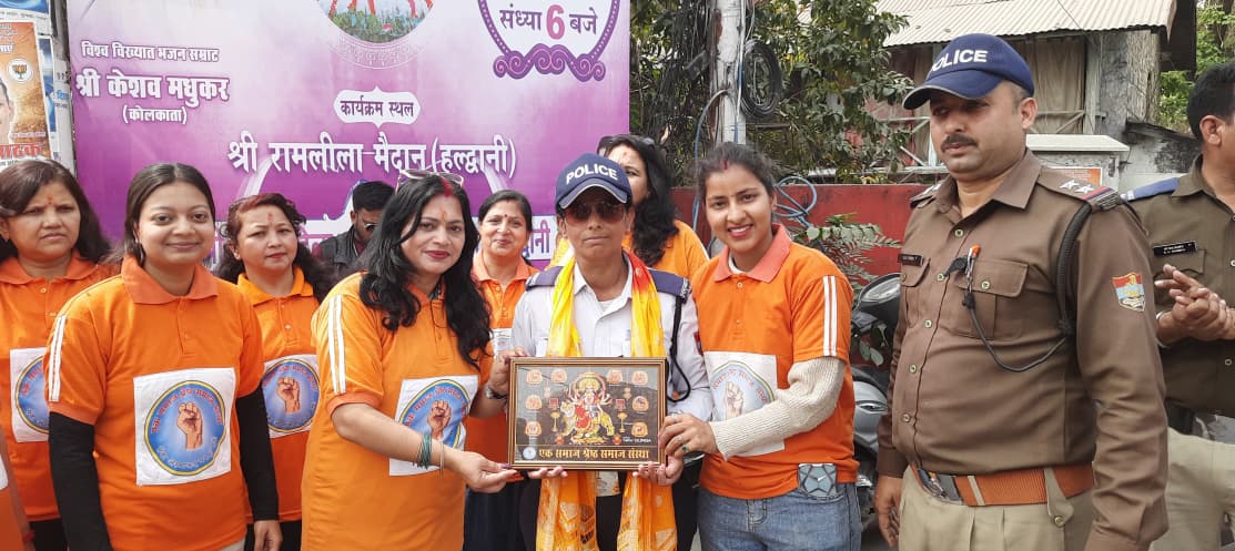 देहरादून। अंतरराष्ट्रीय महिला दिवस के अवसर पर एक समाज श्रेष्ठ समाज संस्था ने महिला ट्रैफिक पुलिसकर्मियों को हल्द्वानी एसडीएम कोर्ट चौराहा में अंगवस्त्र पहनाकर माँ दुर्गा की प्रतिमा देकर सम्मानित किया। इस अवसर पर संस्था अध्यक्ष योगेन्द्र कुमार साहू ने कहा कि महिलाओं को अपने अधिकारों को पहचानकर स्वयं को सशक्त और आत्मनिर्भर बनाना है।
