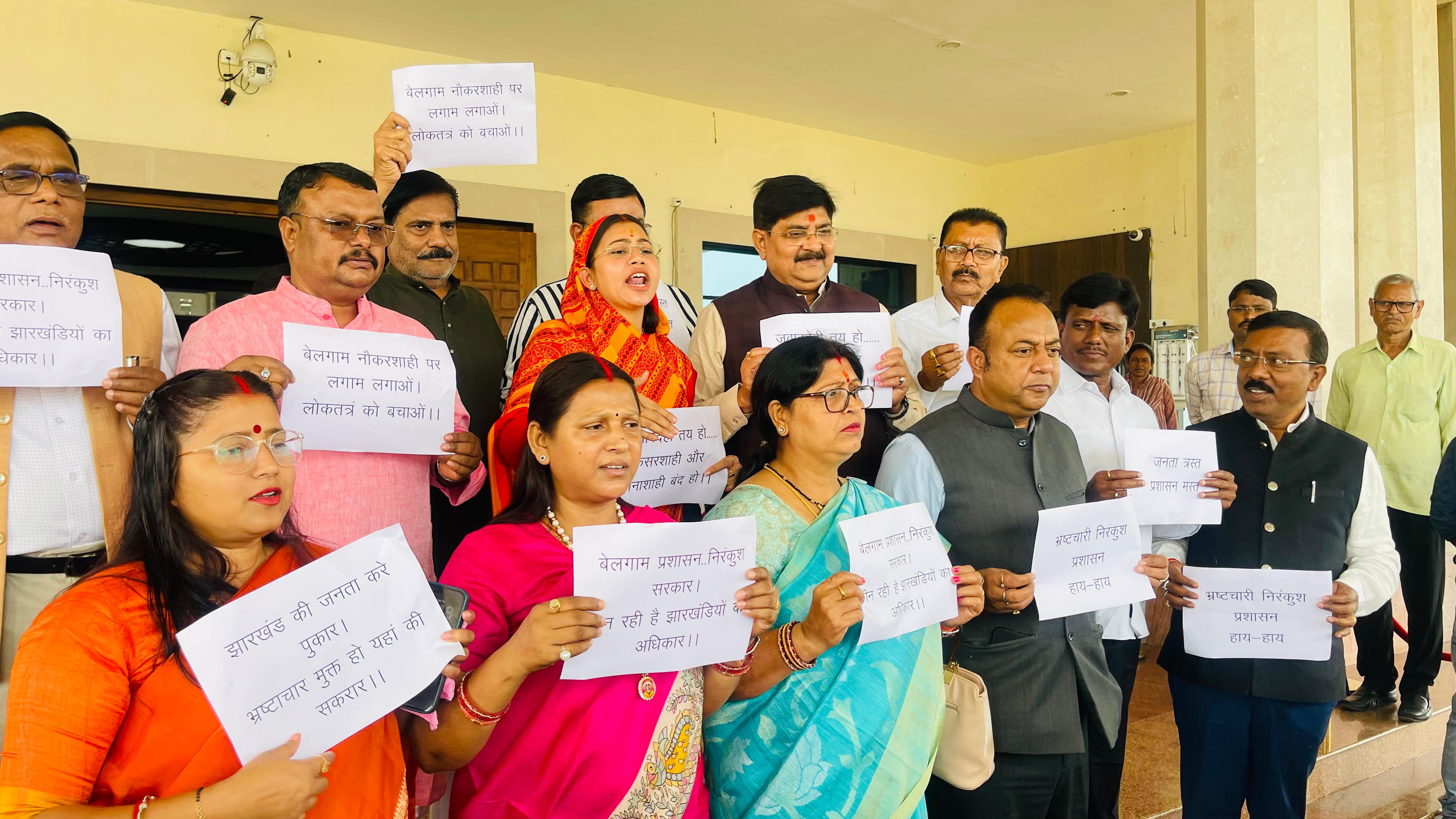 रांची-:राज्य में बिगड़ती कानून-व्यवस्था, बेलगाम पुलिस प्रशासन और सरकार की कार्यशैली के विरोध में आज झारखंड विधानसभा परिसर में भारतीय जनता पार्टी के विधायकों ने जोरदार प्रदर्शन किया। इस दौरान झरिया विधायक रागिनी सिंह अपने साथी भाजपा विधायकों के साथ प्रदर्शन में शामिल हुईं और सरकार के खिलाफ कड़ा विरोध दर्ज कराया।
