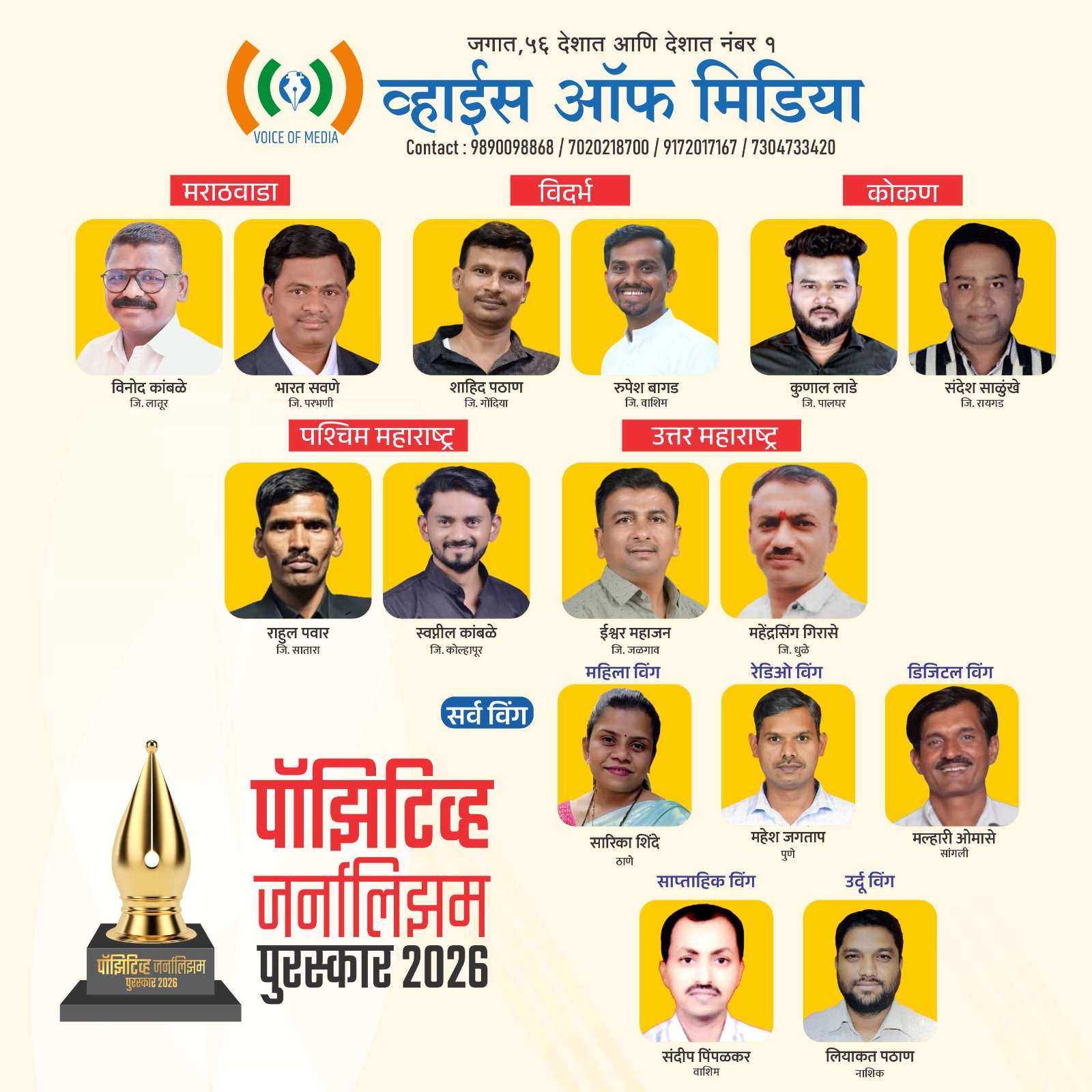 पत्रकारांची देशातील सर्वात मोठी संघटना असलेल्या ‘व्हॉईस ऑफ मीडिया’ ‘व्ही ओ एम इंटरनॅशनल फोरम’ च्या वतीने दिले जाणारे राज्यस्तरीय ‘पॉझिटिव्ह जर्नालिझम पुरस्कार’ आज जाहीर करण्यात आले आहेत. महाराष्ट्र प्रदेशाध्यक्ष अनिल म्हस्के पाटील, संचालक तथा संयोजक गोरक्षनाथ मदने आणि राज्य उपाध्यक्ष अजितदादा कुंकूलोळ यांनी आज या पुरस्कारांची अधिकृत घोषणा केली. सकारात्मक पत्रकारितेचा जागर व्हावा आणि समाजात क्रांती घडवून आणणाऱ्या बातम्यांना बळ मिळावे, या उद्देशाने गेल्या पाच वर्षांपासून या पुरस्कारांचे आयोजन करण्यात येते. राज्य शासन आणि ‘व्हॉईस ऑफ मीडिया’‘व्ही ओ एम इंटरनॅशनल फोरम’च्या वतीने हा पुरस्कार दिला जातो.