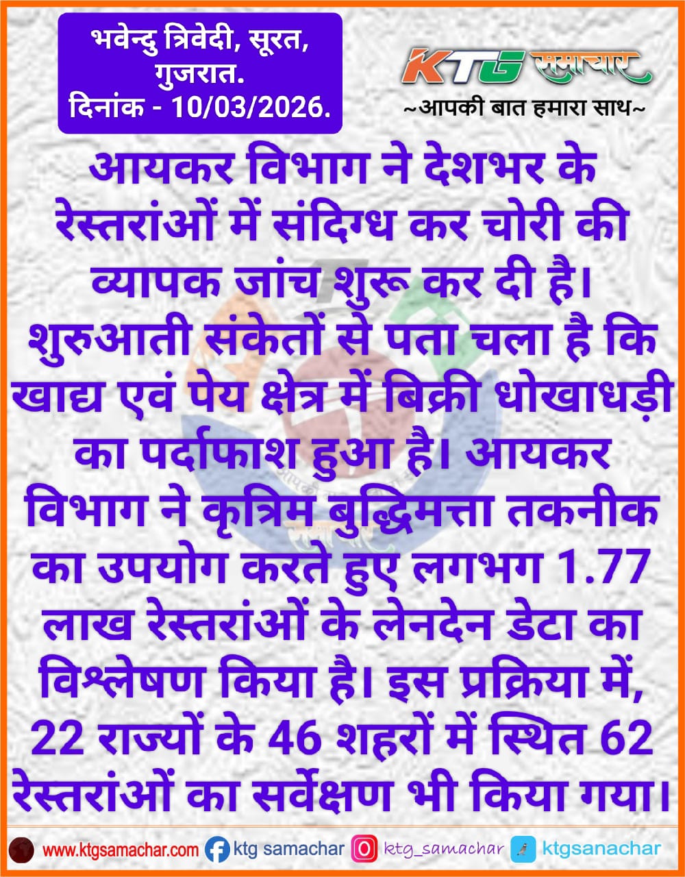 आयकर विभाग ने देशभर के रिस्तराओ मे संदिग्ध कर चोरी की व्यापक जांच शुरू कर दी है।