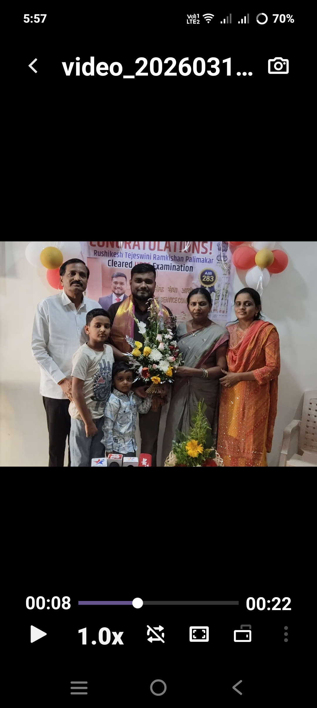 नांदेडःयु पी एस सी 2025 च्या परीक्षेत नांदेड जिल्ह्यातील कौठा तालुका कंधार येथील ऋषिकेश प्रा.रामकिशन पालीमकर हा विद्यार्थी देशपातळीवर 294 क्रमांक उत्तीर्ण झाला .त्याच्या घवघवीत यशामुळे नांदेड जिल्ह्याचे नाव राज्यस्तरावर लौकिक झाले .ऋषिकेश चे वडील प्राध्यापक रामकिशन पालीमवार व आई तेजाबाई बहिण पुजा व पालीमवार परिवारात आनंदाचे वातावरण पसरले आहे . सौ. पुजा गजानन होळगे, महादेव कनके,शिवाजी पालीमकर,गुरुनाथ कणके, किरण कनके दुबई व सर्व मित्र परिवारातर्फे शुभेच्छाचा वर्षाव होत आहे .