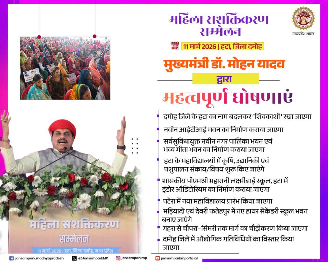 मुख्यमंत्री डॉ. मोहन यादव द्वारा दमोह जिले के हटा में आयोजित महिला सशक्तिकरण सम्मेलन में सहभागिता
