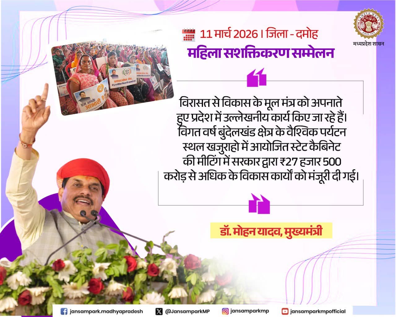 विरासत से विकास के मूल मंत्र को अपनाते हुए प्रदेश में उल्लेखनीय कार्य किए जा रहे हैं। विगत वर्ष बुंदेलखंड क्षेत्र के वैश्विक पर्यटन स्थल खजुराहो में आयोजित स्टेट कैबिनेट की मीटिंग में सरकार द्वारा ₹27 हजार 500 करोड़ से अधिक के विकास कार्यों को मंजूरी दी गई।