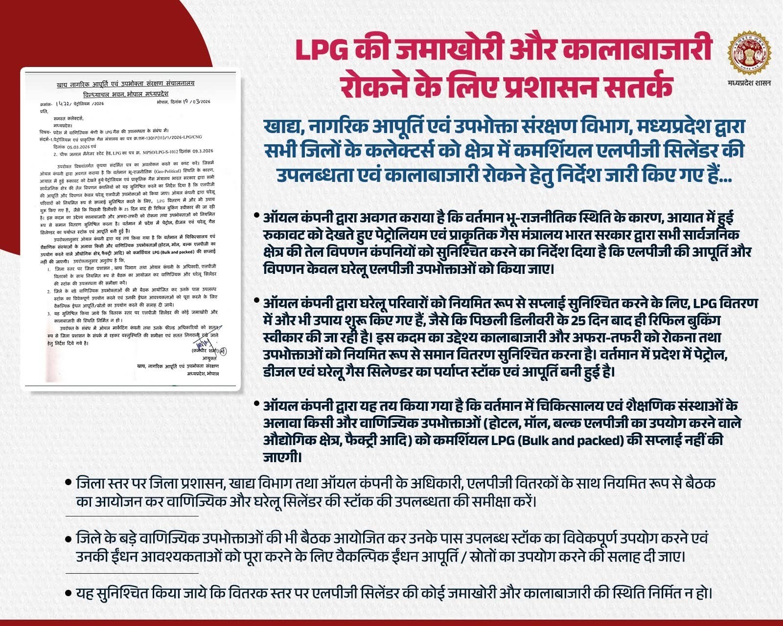 मध्यप्रदेश सरकार द्वारा प्रदेश के सभी जिलों के कलेक्टर्स को कमर्शियल एलपीजी सिलेंडरों की उपलब्धता सुनिश्चित करने तथा उनकी जमाखोरी और कालाबाजारी पर रोक लगाने के संबंध में निर्देश जारी