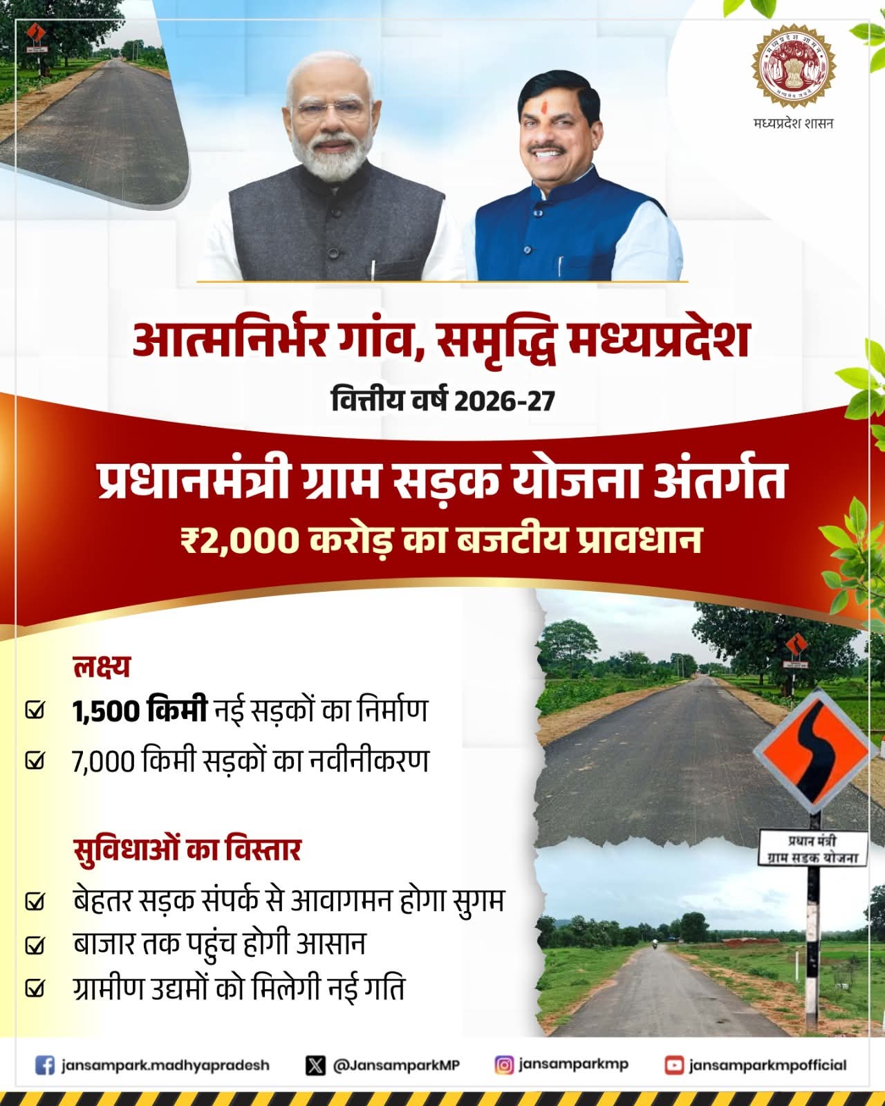 प्रधानमंत्री ग्राम सड़क योजना अंतर्गत ₹2,000 करोड़ का बजटीय प्रावधान