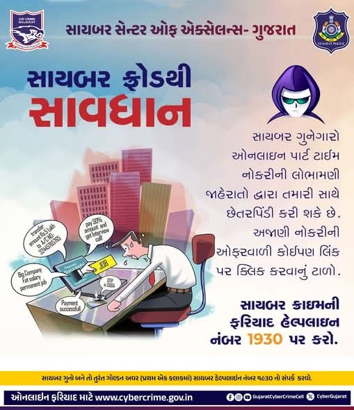 સાયબર ગુનેગારો ઓનલાઇન પાર્ટ ટાઈમ નોકરીમાં બમણા પૈસા કમાઓ એવી જાહેરાતો મૂકીને તમારી સાથે છેતરપિંડી કરી શકે છે.