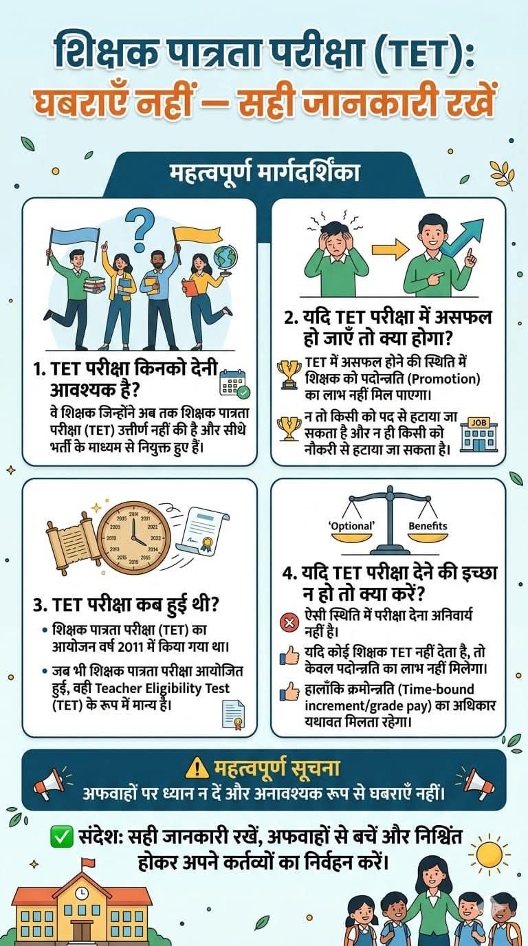 सुपरम कोर्ट ने एक आदेश पारित किया है कि ऐसे शिक्षक जिनकी नियुक्ति 2009 से पहले हुई है उन्हें पात्रता परीक्षा पास करना होगा ।इसके लिए 2 वर्ष का समय दिया गया है ।ऐसे शिक्षक जिनकी सेवा अवधि 5 वर्ष रह गईं हैं उन्हें परीक्षा से छूट दी गई हैं ।जो शिक्षक परीक्षा पास नहीं कर पाएंगे उनकी सेवाए समाप्त कर दी जाएगी ।