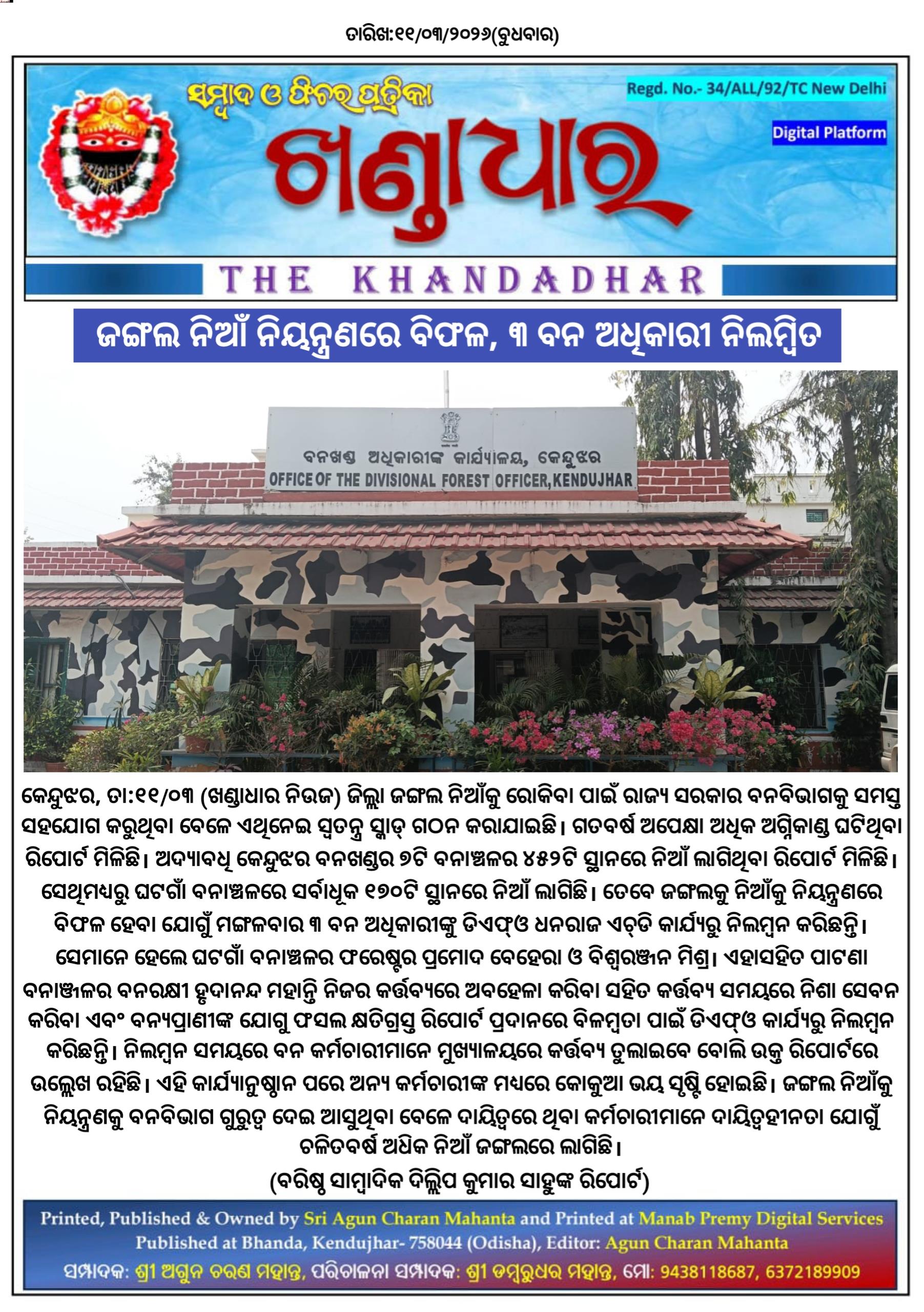 ଜଙ୍ଗଲ ନିଆଁ ନିୟନ୍ତ୍ରଣରେ ବିଫଳ, ୩ ବନ ଅଧିକାରୀ ନିଲମ୍ବିତ।