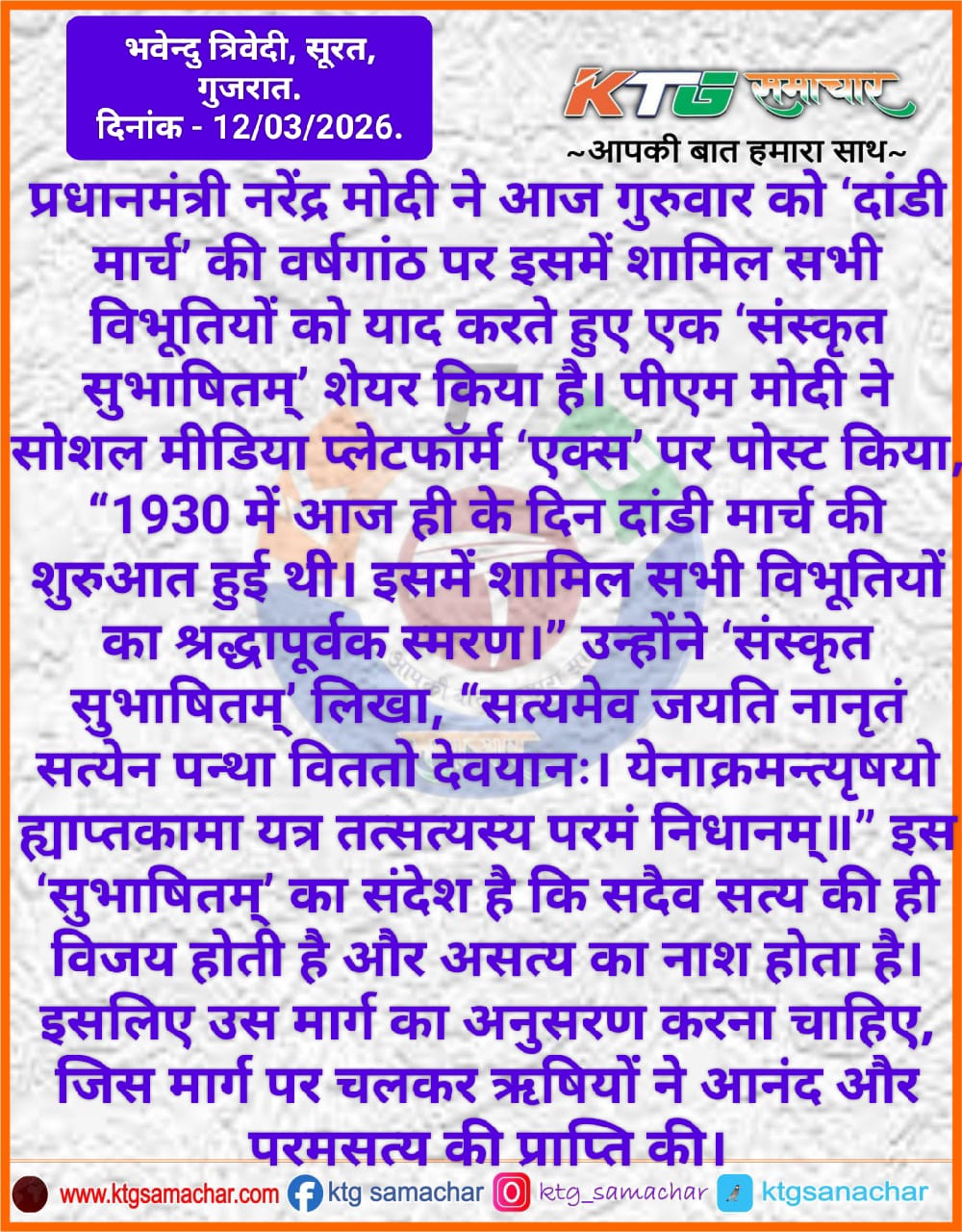 प्रधानमंत्री नरेंद्र मोदी ने सोशल मीडिया प्लेटफार्म पर पोस्ट किया "1930 में आज ही के दिन दांडी मार्च की शुरुआत हुई थी।"