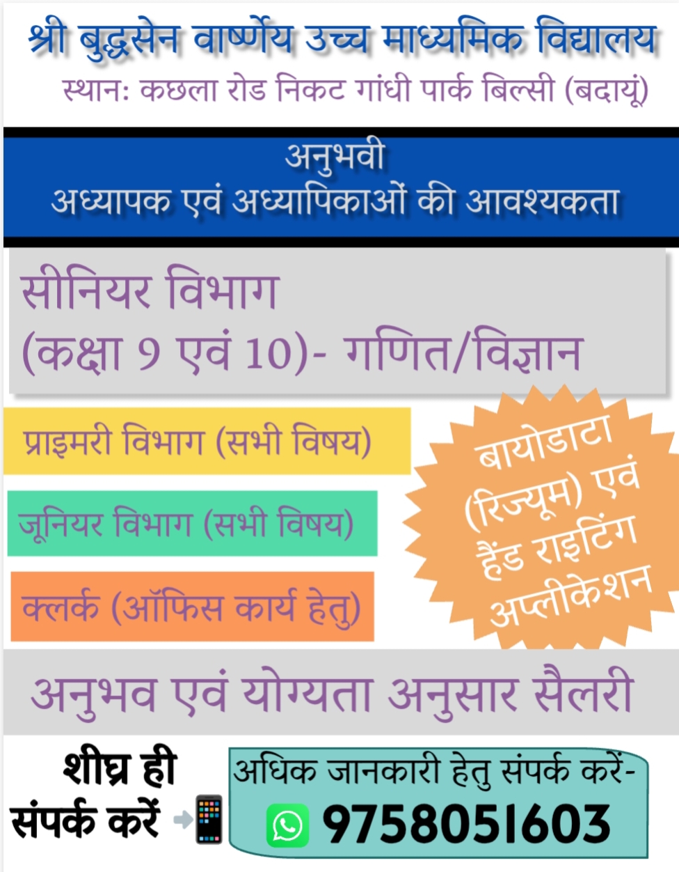 श्री बुद्धसेन वार्ष्णेय उच्च माध्यमिक विद्यालय में अध्यापक/अध्यापिकाओं की आवश्यकता, शीघ्र ही संपर्क करें |