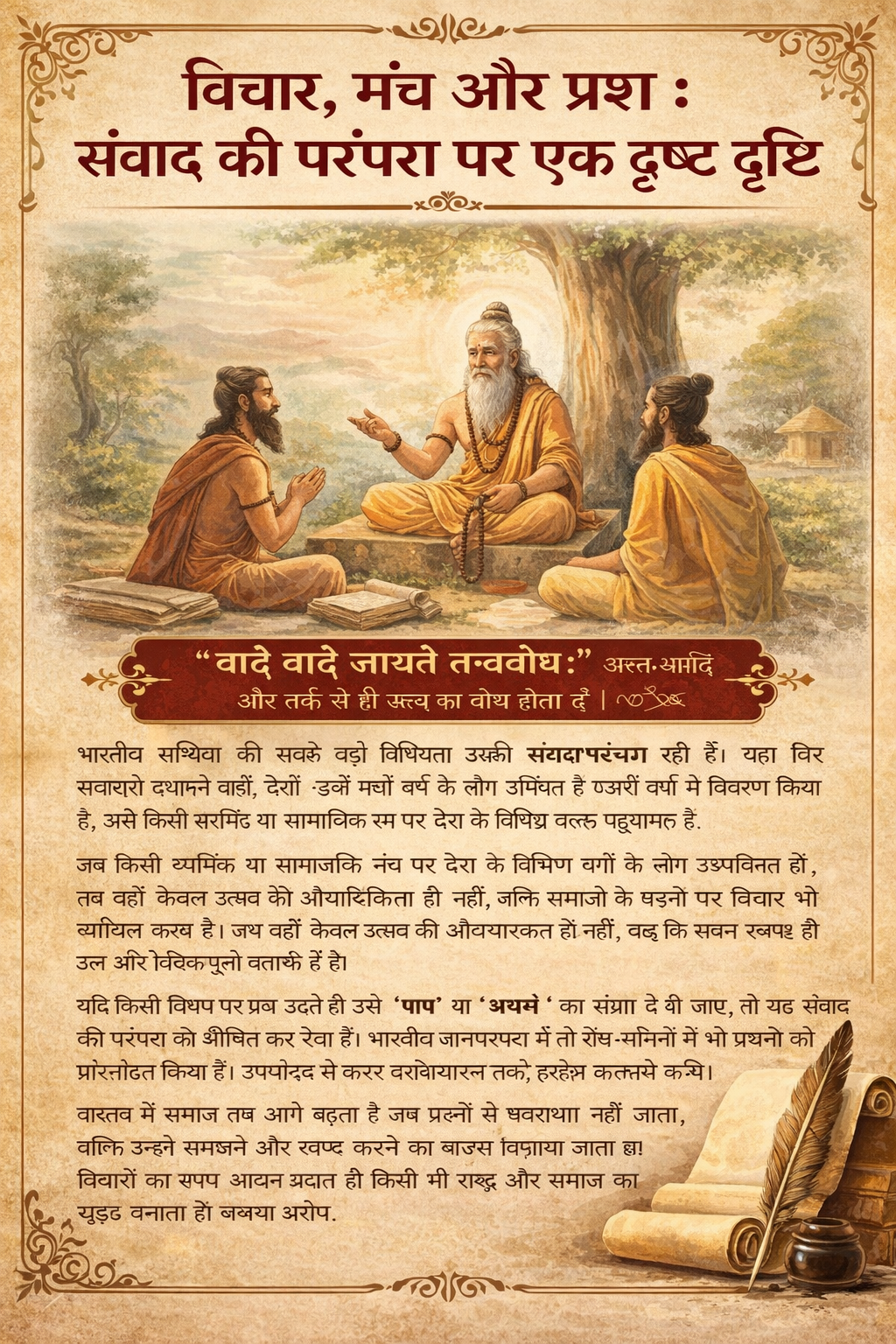 भारतीय सभ्यता की सबसे बड़ी विशेषता उसकी संवादपरंपरा रही है। यहाँ विचारों को दबाने की नहीं, उन्हें सामने लाकर परखने की संस्कृति विकसित हुई है। हमारे शास्त्रों में स्पष्ट कहा गया है— “वादे वादे जायते तत्त्वबोधः” अर्थात् विचारों के आदान-प्रदान और तर्क-वितर्क से ही सत्य का बोध होता है। इसलिए किसी भी मंच पर उठे प्रश्नों को केवल विवाद मान लेना, उस महान परंपरा के साथ न्याय नहीं करता जिसे भारतीय मनीषा ने हजारों वर्षों में विकसित किया है।