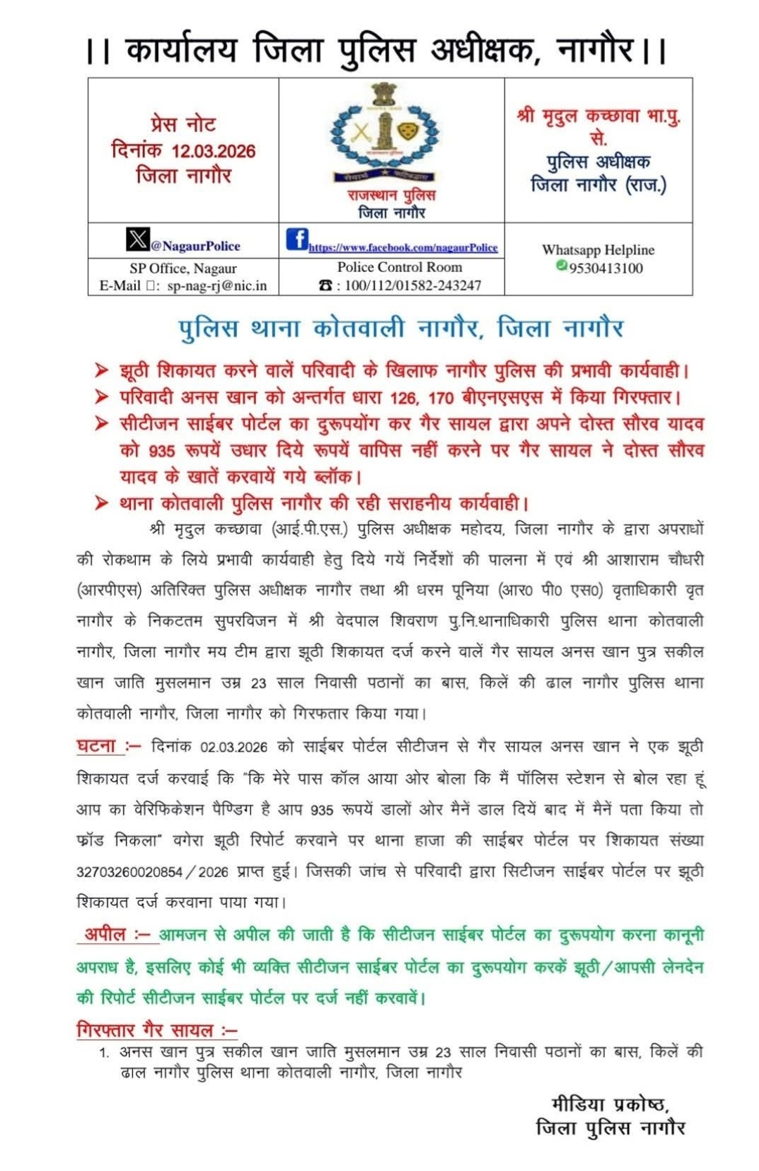 अब गलत मुकदमा दर्ज करवाने वालों की खैर नहीं, झूठा मुकदमा दर्ज करवाकर किसी से आँट निकालने वाले सावधान हो जाए, अब नए जमाने की पुलिसिंग है,जिसमें नागौर पुलिस अधीक्षक मृदुल कच्छावा अपनी कार्यशैली से रोजाना पब्लिक को नए संदेश दे रहे हैं।
