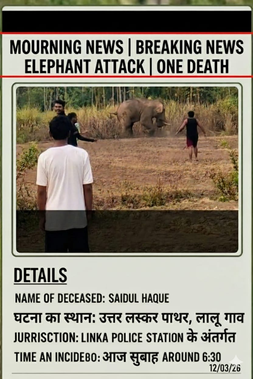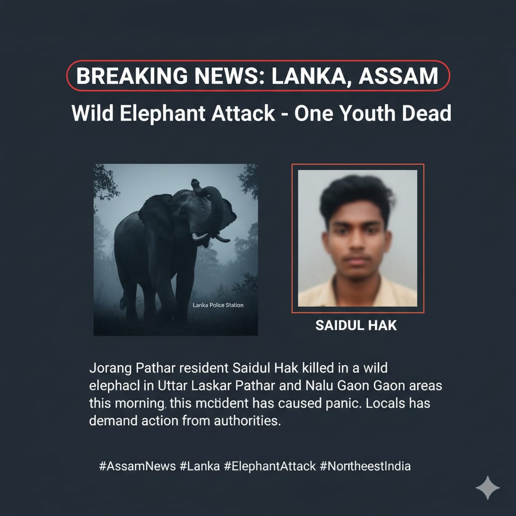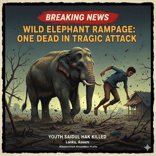 Lanka, Assam: A tragic incident occurred today around 6:30 AM in the Uttar Laskar Pathar and Nalu Gaon areas under Lanka Police Station. A youth identified as Saidul Hak, a resident of Jorang Pathar, lost his life in a wild elephant attack. The incident has sparked panic and mourning in the region. Locals are demanding immediate action from the authorities to prevent such conflicts.