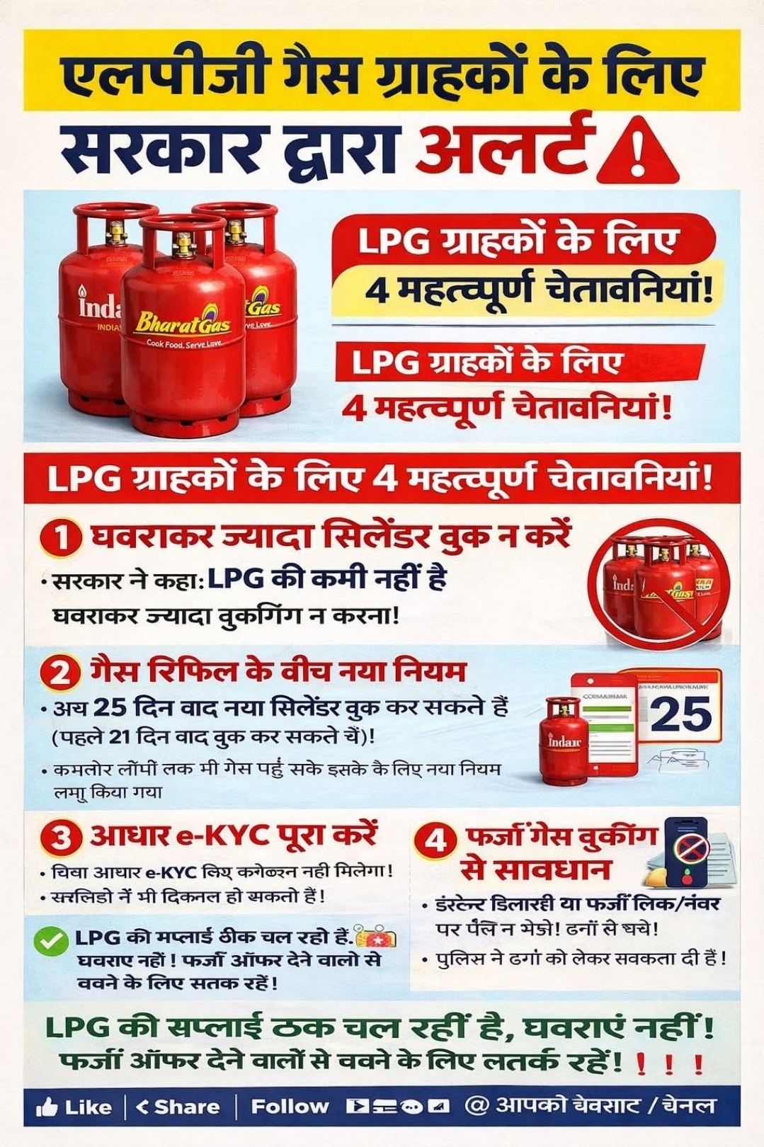 भारत में LPG (घरेलू गैस) ग्राहकों के लिए सरकार ने कुछ महत्वपूर्ण अलर्ट जारी किए हैं: