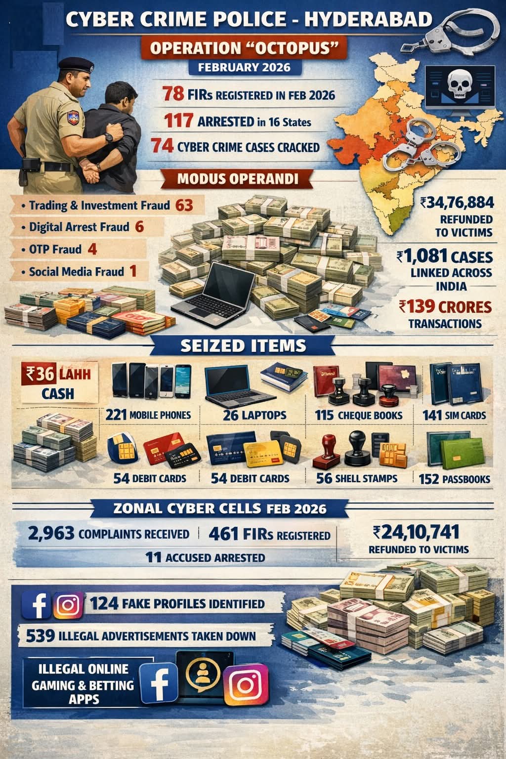 The Cyber Crime Police Station Hyderabad registered 78 FIRs during February 2026. Under the special drive “Operation Octopus”, Cyber Crime Police along with Law & Order teams arrested 117 accused persons from 16 States in connection with 74 cyber crime cases.