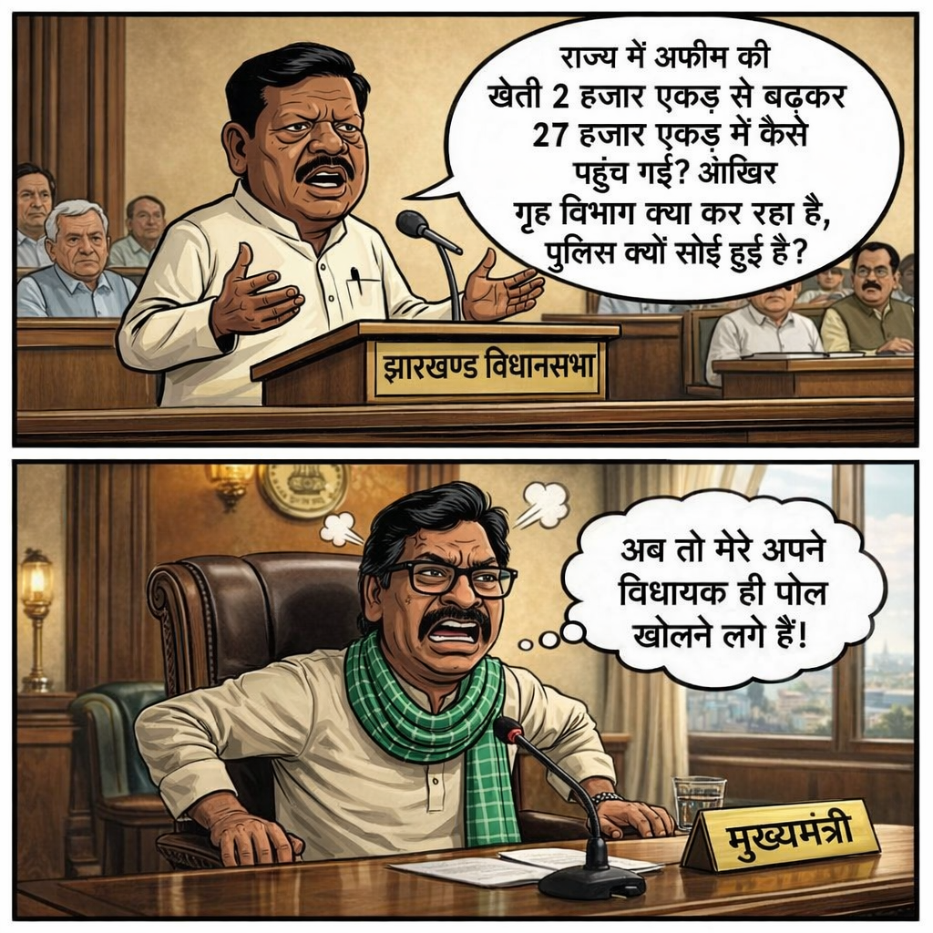झारखंड की राजनीति में उस समय हलचल मच गई जब विधानसभा के भीतर ही सत्तारूढ़ दल JMM के विधायक हेमलाल मुर्मू ने अपनी ही सरकार को कटघरे में खड़ा कर दिया। विधानसभा की कार्यवाही के दौरान उन्होंने राज्य में तेजी से बढ़ रही अफीम की अवैध खेती को लेकर सरकार पर गंभीर सवाल उठाए।