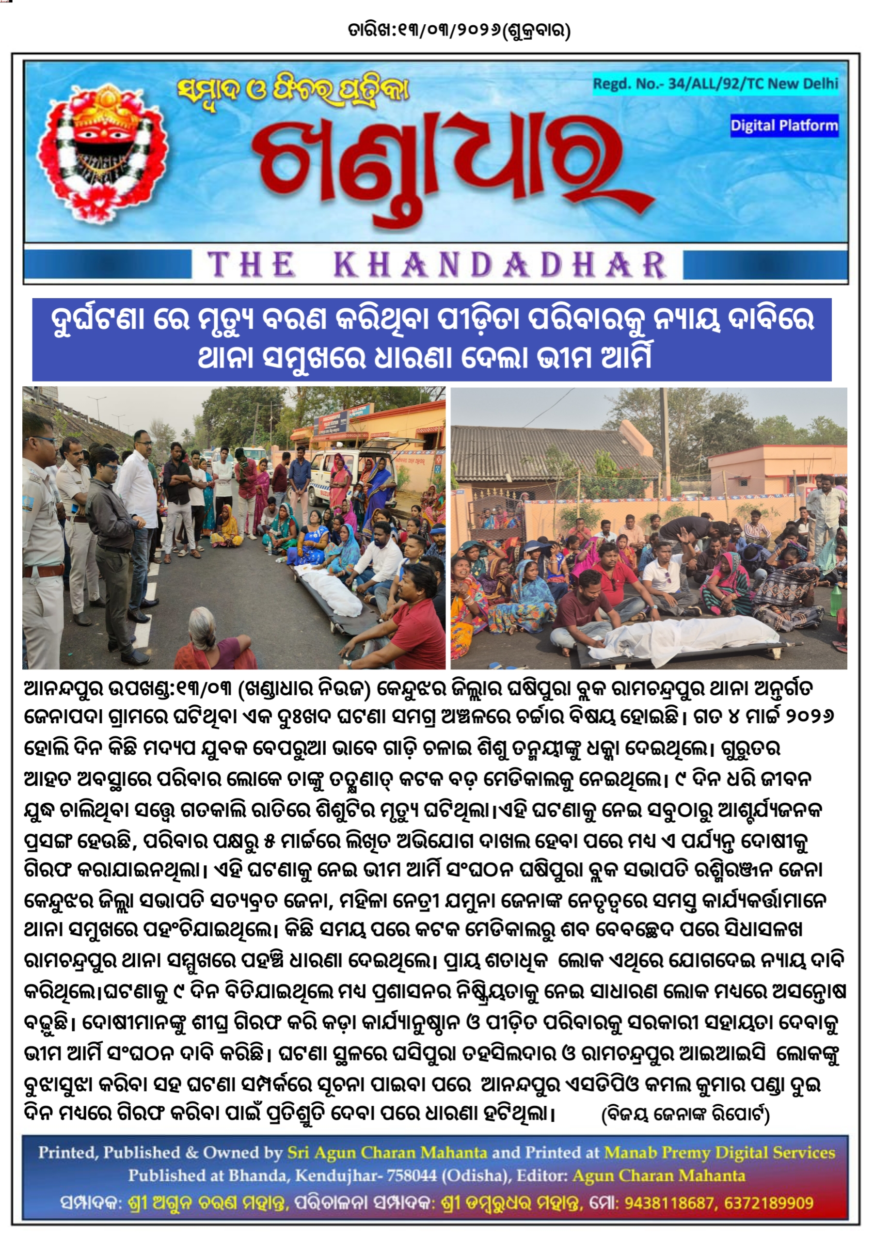 ଆନନ୍ଦପୁର ଉପଖଣ୍ଡ:୧୩/୦୩, କେନ୍ଦୁଝର ଜିଲ୍ଲାର ଘଷିପୁରା ବ୍ଲକ ରାମଚନ୍ଦ୍ରପୁର ଥାନା ଅନ୍ତର୍ଗତ ଜେନାପଦା ଗ୍ରାମରେ ଘଟିଥିବା ଏକ ଦୁଃଖଦ ଘଟଣା ସମଗ୍ର ଅଞ୍ଚଳରେ ଚର୍ଚ୍ଚାର ବିଷୟ ହୋଇଛି। ଗତ ୪ ମାର୍ଚ୍ଚ ୨୦୨୬ ହୋଲି ଦିନ କିଛି ମଦ୍ୟପ ଯୁବକ ବେପରୁଆ ଭାବେ ଗାଡ଼ି ଚଳାଇ ଶିଶୁ ତନ୍ମୟୀଙ୍କୁ ଧକ୍କା ଦେଇଥିଲେ। ଗୁରୁତର ଆହତ ଅବସ୍ଥାରେ ପରିବାର ଲୋକେ ତାଙ୍କୁ ତତ୍କ୍ଷଣାତ୍ କଟକ ବଡ଼ ମେଡିକାଲକୁ ନେଇଥିଲେ। ୯ ଦିନ ଧରି ଜୀବନ ଯୁଦ୍ଧ ଚାଲିଥିବା ସତ୍ତ୍ୱେ ଗତକାଲି ରାତିରେ ଶିଶୁଟିର ମୃତ୍ୟୁ ଘଟିଥିଲା।ଏହି ଘଟଣାକୁ ନେଇ ସବୁଠାରୁ ଆଶ୍ଚର୍ଯ୍ୟଜନକ ପ୍ରସଙ୍ଗ ହେଉଛି, ପରିବାର ପକ୍ଷରୁ ୫ ମାର୍ଚ୍ଚରେ ଲିଖିତ ଅଭିଯୋଗ ଦାଖଲ ହେବା ପରେ ମଧ୍ୟ ଏ ପର୍ଯ୍ୟନ୍ତ ଦୋଷୀକୁ ଗିରଫ କରାଯାଇନଥିଲା। ଏହି ଘଟଣାକୁ ନେଇ ଭୀମ ଆର୍ମି ସଂଘଠନ ଘଷିପୁରା ବ୍ଲକ ସଭାପତି ରଶ୍ମିରଞ୍ଜନ ଜେନା କେନ୍ଦୁଝର ଜିଲ୍ଲା ସଭାପତି ସତ୍ୟବ୍ରତ ଜେନା,ମହିଳା ନେତ୍ରୀ ଯମୁନା ଜେନାଙ୍କ ନେତୃତ୍ୱରେ ସମସ୍ତ କାର୍ଯ୍ୟକର୍ତ୍ତାମାନେ ଥାନା ସମୁଖରେ ପହଂଚିଯାଇଥିଲେ। କିଛି ସମୟ ପରେ କଟକ ମେଡିକାଲରୁ ଶବ ବେବଚ୍ଛେଦ ପରେ ସିଧାସଳଖ ରାମଚନ୍ଦ୍ରପୁର ଥାନା ସମ୍ମୁଖରେ ପହଞ୍ଚି ଧାରଣା ଦେଇଥିଲେ। ପ୍ରାୟ ଶତାଧିକ ଲୋକ ଏଥିରେ ଯୋଗଦେଇ ନ୍ୟାୟ ଦାବି କରିଥିଲେ।ଘଟଣାକୁ ୯ ଦିନ ବିତିଯାଇଥିଲେ ମଧ୍ୟ ପ୍ରଶାସନର ନିଷ୍କ୍ରିୟତାକୁ ନେଇ ସାଧାରଣ ଲୋକ ମଧ୍ୟରେ ଅସନ୍ତୋଷ ବଢ଼ୁଛି। ଦୋଷୀମାନଙ୍କୁ ଶୀଘ୍ର ଗିରଫ କରି କଡ଼ା କାର୍ଯ୍ୟାନୁଷ୍ଠାନ ଓ ପୀଡ଼ିତ ପରିବାରକୁ ସରକାରୀ ସହାୟତା ଦେବାକୁ ଭୀମ ଆର୍ମି ସଂଘଠନ ଦାବି କରିଛି। ଘଟଣା ସ୍ଥଳରେ ଘସିପୁରା ତହସିଲଦାର ଓ ରାମଚନ୍ଦ୍ରପୁର ଆଇଆଇସି ଲୋକଙ୍କୁ ବୁଝାସୁଝା କରିବା ସହ ଘଟଣା ସମ୍ପର୍କରେ ସୂଚନା ପାଇବା ପରେ ଆନନ୍ଦପୁର ଏସଡିପିଓ କମଲ କୁମାର ପଣ୍ଡା ଦୁଇ ଦିନ ମଧ୍ୟରେ ଗିରଫ କରିବା ପାଇଁ ପ୍ରତିଶ୍ରୁତି ଦେବା ପରେ ଧାରଣା ହଟିଥିଲା।