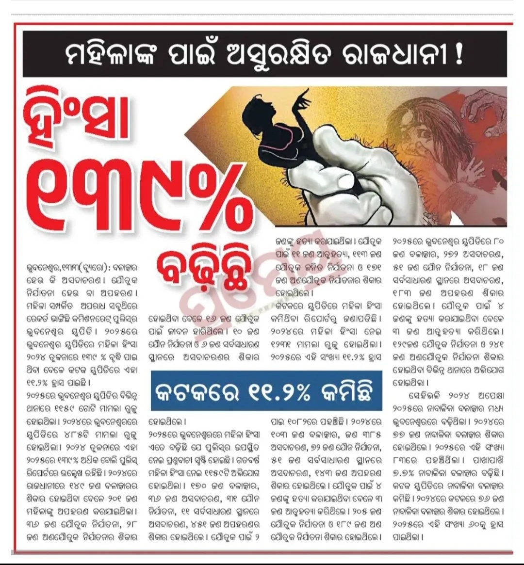 ମହିଳାମାନଙ୍କ ପାଇଁ ଅସୁରକ୍ଷିତ ହୋଇଛି ରାଜଧାନୀ।ହିଂସା 193% ବଢ଼ିଛି। କଟକରେ 11.2% କମିଛି।