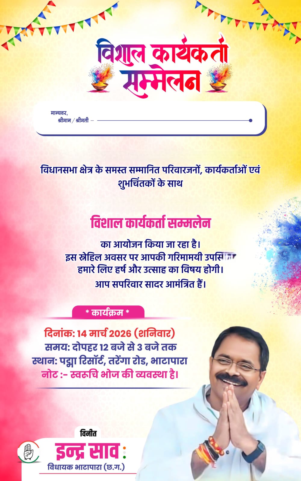 भाटापारा::- ब्लॉक कांग्रेस कमेटी भाटापारा द्वारा विधानसभा स्तरीय विशाल कांग्रेस कार्यकर्ता सम्मेलन का आयोजन आज 14 मार्च शनिवार को पद्मा रिसॉर्ट भाटापारा में आयोजित किया गया है। इस कार्यकर्ता सम्मेलन में भाटापारा विधायक इन्द्र साव विशेष रूप से उपस्थित रहकर अपना मार्गदर्शन देंगे साथ ही उपस्थित वरिष्ठ नेताओं एवं कार्यकर्ताओ को सम्मानित करेंगे l