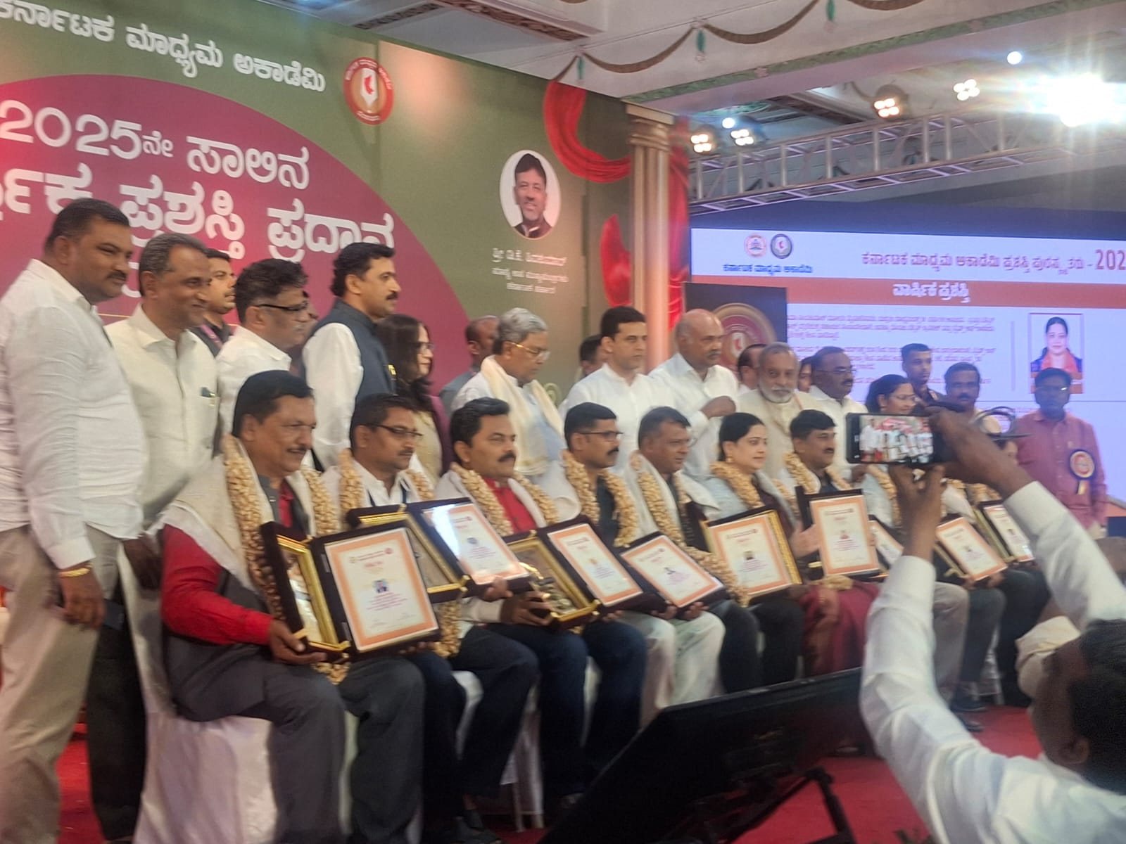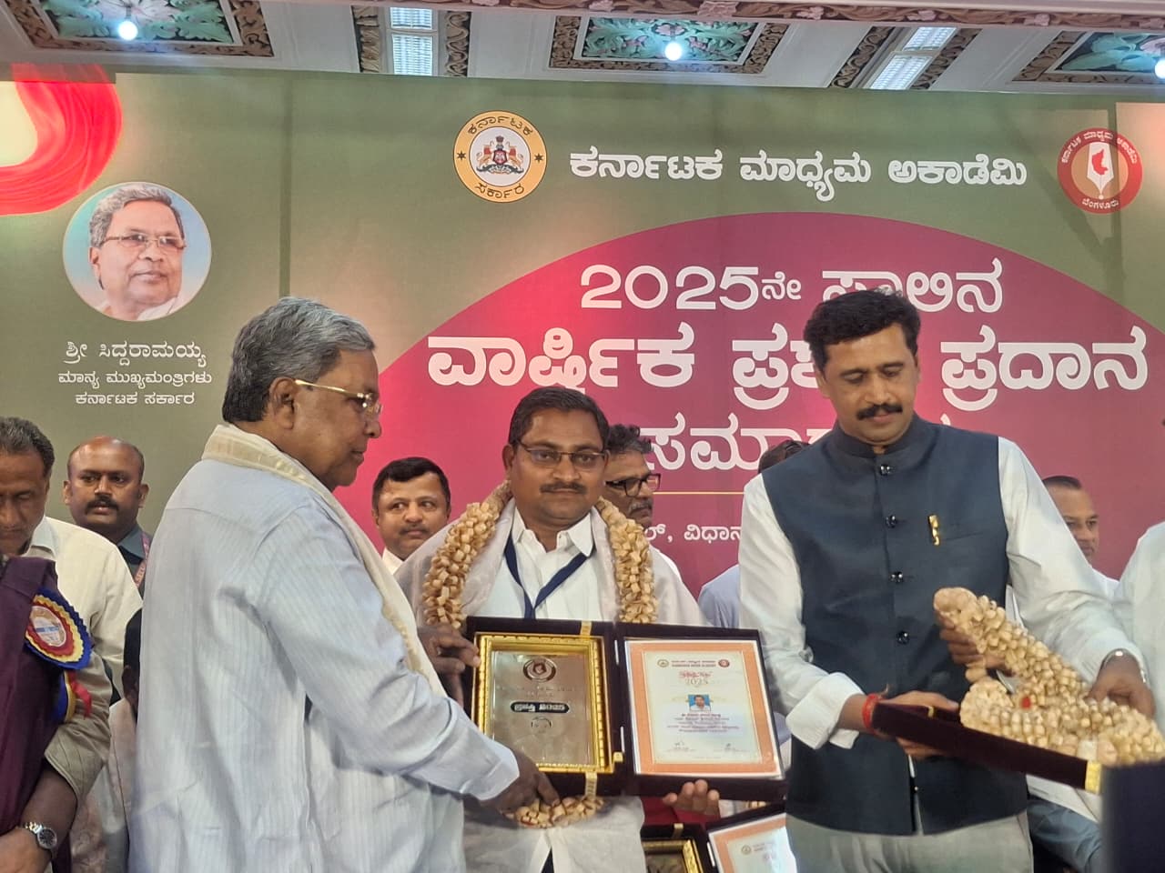 *ಚಿಕ್ಕೋಡಿ: ಚಿಕ್ಕೋಡಿ ವರದಿಗಾರರಾದ ಸಂಜೀವ ವಸಂತ ಕಾಂಬಳೆ ಅವರಿಗೆ 2025 ನೇ ಸಾಲಿನ ಕರ್ನಾಟಕ ಮಾಧ್ಯಮ ಅಕಾಡೆಮಿ ಪ್ರಶಸ್ತಿಯನ್ನು ಮುಖ್ಯಮಂತ್ರಿ ಸಿದ್ದರಾಮಯ್ಯನವರು ಬೆಂಗಳೂರಿನ ಬಾಂಕ್ವೇಟ್ ಸಭಾ ಭವನದಲ್ಲಿ ಶುಕ್ರವಾರ ಸಂಜೆ ಪ್ರಶಸ್ತಿಯನ್ನು ಪ್ರದಾನ ಮಾಡಿದರು.ಪತ್ರಿಕೋದ್ಯಮದಲ್ಲಿ ಸಲ್ಲಿಸಿದ ಸೇವೆಯನ್ನು ಪರಿಗಣಿಸಿ ಕರ್ನಾಟಕ ಮಾಧ್ಯಮ ಅಕಾಡೆಮಿ 2025 ಪ್ರಶಸ್ತಿಗೆ ಭಾಜನರಾಗಿದ್ದಾರೆ.ಸಂಜೀವ ಕಾಂಬಳೆ ಅವರು ಗಡಿಭಾಗದ ಹಲವಾರು ಸಮಸ್ಯೆಗಳ ಬಗ್ಗೆ ಸರಕಾರದ ಗಮನ ಸೆಳೆದಿದ್ದರು.ಗಡಿ ಭಾಗದ ಸಾಕಷ್ಟು ಸಮಸ್ಯೆಗಳ ಲೇಖನ ಬರೆದು ಅಲ್ಲಿನ ಸಮಸ್ಯೆಗೆ ಪರಿಹಾರ ಒದಗಿಸುವಲ್ಲಿ ಪ್ರಾಮಾಣಿಕವಾದ ಕಾರ್ಯ ಮಾಡಿದ್ದಾರೆ.ಇಲ್ಲಿವರಿಗೆ ಪತ್ರಿಕೋದ್ಯಮದಲ್ಲಿನ ಸಲ್ಲಿಸಿದ ಸೇವೆ ಗಮನಿಸಿ ಬೆಳಗಾವಿ ಜಿಲ್ಲಾಡಳಿತ ನವೆಂಬರ 1,2025 ರಂದು ಕನ್ನಡ ರಾಜ್ಯೋತ್ಸವ ಪ್ರಶಸ್ತಿ ನೀಡಿ ಗೌರವಿಸಿತ್ತು.ಬೆಂಗಳೂರಿನಲ್ಲಿ ನಡೆದ ಕನ್ನಡ ಮಾಧ್ಯಮ ಅಕಾಡೆಮಿ ಪ್ರಶಸ್ತಿ ವಿತರಣೆಯಲ್ಲಿ ಶಿವಾಜಿನಗರದ ಶಾಸಕ ರಿಜ್ವಾನ ಅರ್ಷದ, ಸಿಎಂ ಮಾಧ್ಯಮ ಸಲಹೆಗಾರ ಕೆ.ವಿ.ಪ್ರಭಾಕರ, ಕರ್ನಾಟಕ ಮಾಧ್ಯಮ ಅಕಾಡೆಮಿ ಅಧ್ಯಕ್ಷೆ ಆಯೇಷಾ ಖಾನಂ, ವಾರ್ತಾ ಮತ್ತು ಸಾರ್ವಜನಿಕ ಸಂಪರ್ಕ ಅಧಿಕಾರಿ ಹೇಮಂತ ನಿಂಬಾಳಕರ, ಕಾರ್ಯದರ್ಶಿ ಕಾವೇರಿ, ನಾಡೋಜ ಹಂಪನಾ ನಾಗರಾಜ್, ನಾಟಕ ಅಕಾಡೆಮಿ ಅಧ್ಯಕ್ಷ ನಾಗರಾಜ ಮೂರ್ತಿ, ಇತರರು ಉಪಸ್ಥಿತರಿದ್ದರು.*