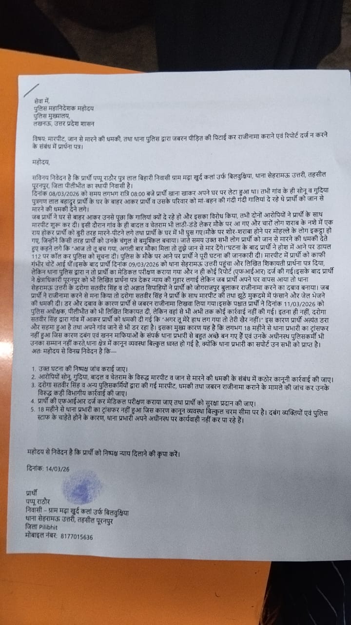 मामला पूरनपुर तहसील क्षेत्र के ग्राम मढ़ा खुर्द कलां उर्फ बिलवुक्षिया का है। यहाँ के निवासी पप्पू राठौर का आरोप है कि गांव में हुए एक विवाद के बाद उन्होंने सेहरामऊ उत्तरी थाने में लिखित तहरीर दी थी। लेकिन आरोप है कि पुलिस ने दोषियों पर कार्रवाई करने के बजाय पीड़ित को ही प्रताड़ित करना शुरू कर दिया।