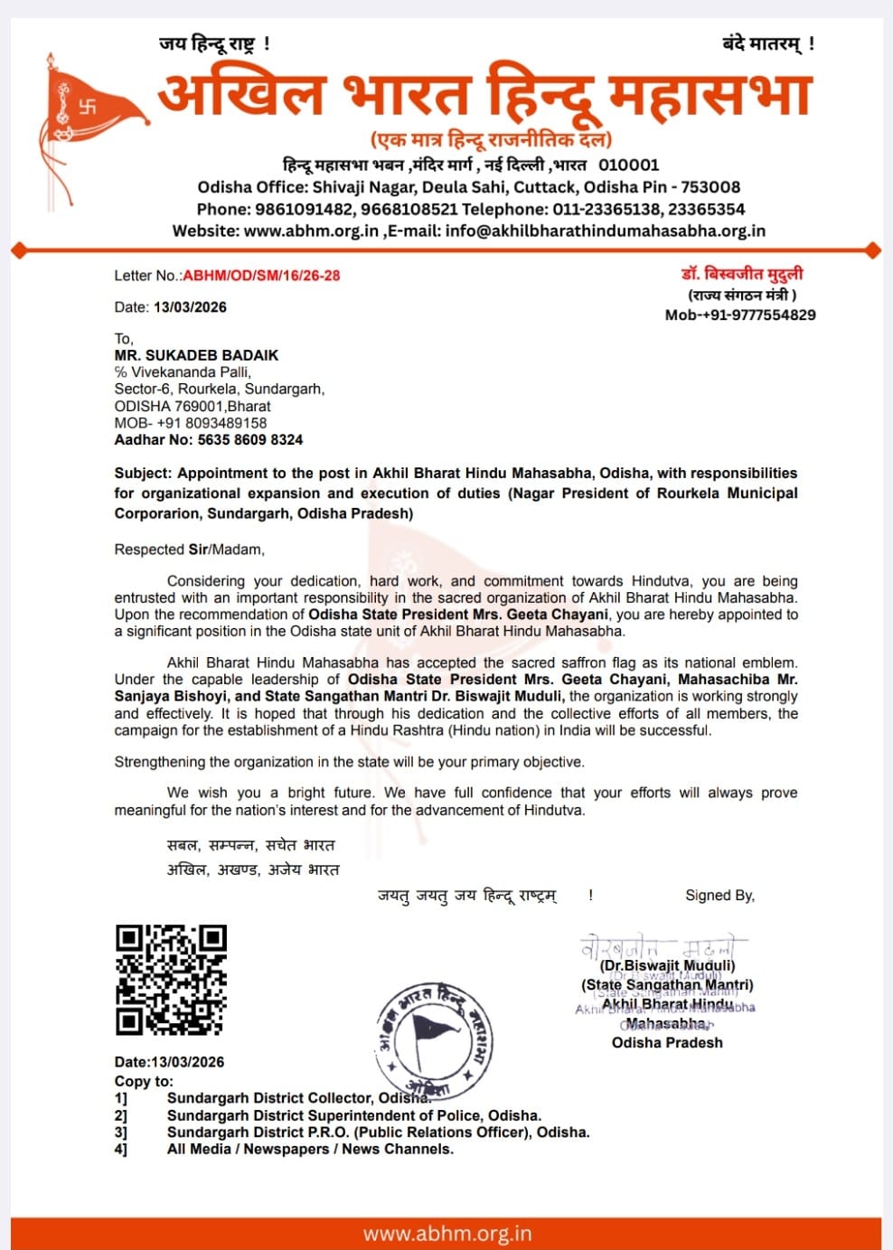 *ଅଖିଳ ଭାରତୀୟ ହିନ୍ଦୁ ମହାସଭାର ରାଉଲକେଲା ନଗର ସଭାପତି ହେଲେ ଶୁକଦେବ*