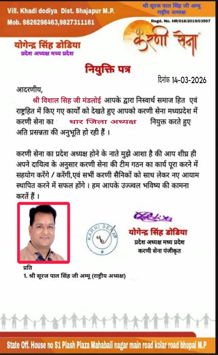 करणी सेना में नई जिम्मेदारी — विशाल सिंह मंडलोई बने धार जिला अध्यक्ष