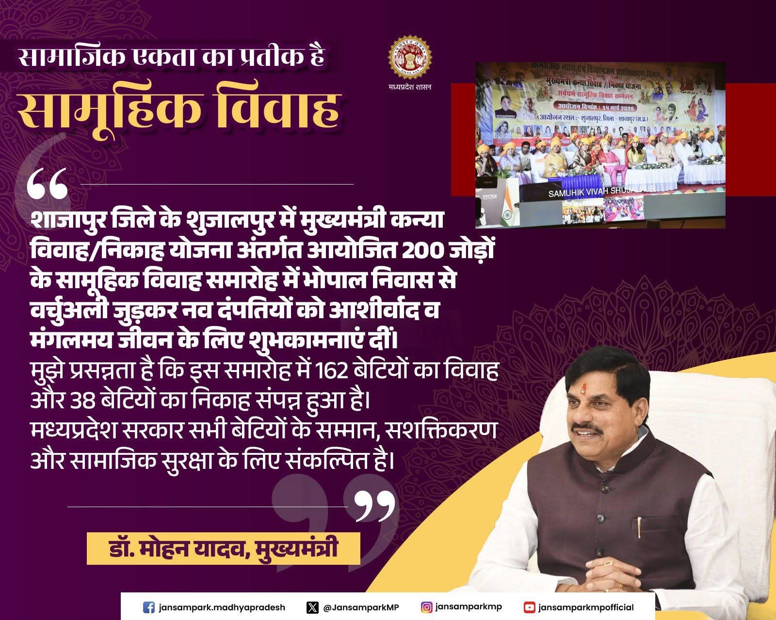 शाजापुर जिले के शुजालपुर में मुख्यमंत्री कन्या विवाह/निकाह योजना अंतर्गत आयोजित 200 जोड़ों के सामूहिक विवाह समारोह में भोपाल निवास से वर्चुअली जुड़कर नवदंपतियों को आशीर्वाद व मंगलमय जीवन के लिए शुभकामनाएं दीं।