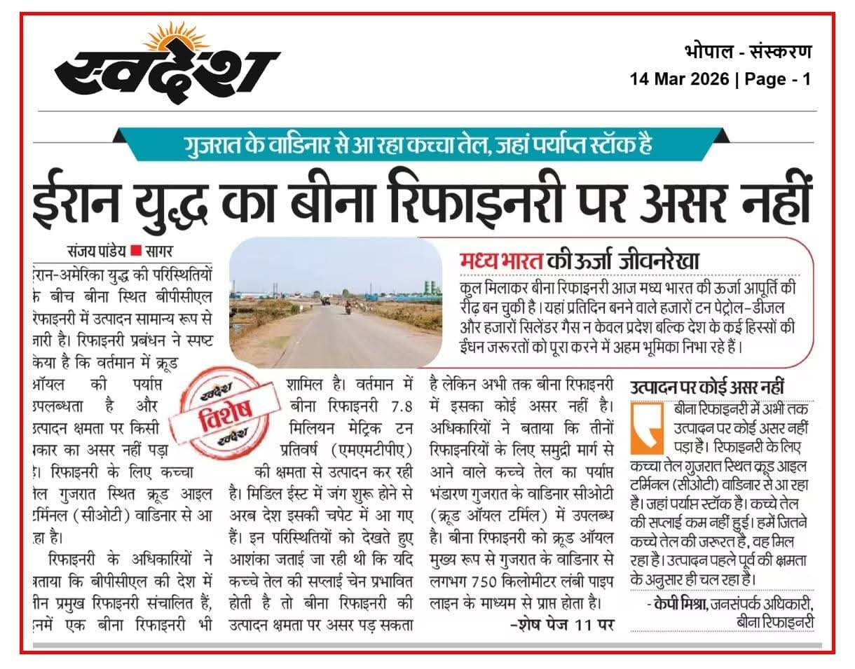 ईरान युद्ध का बीना रिफाइनरी पर असर नहीं