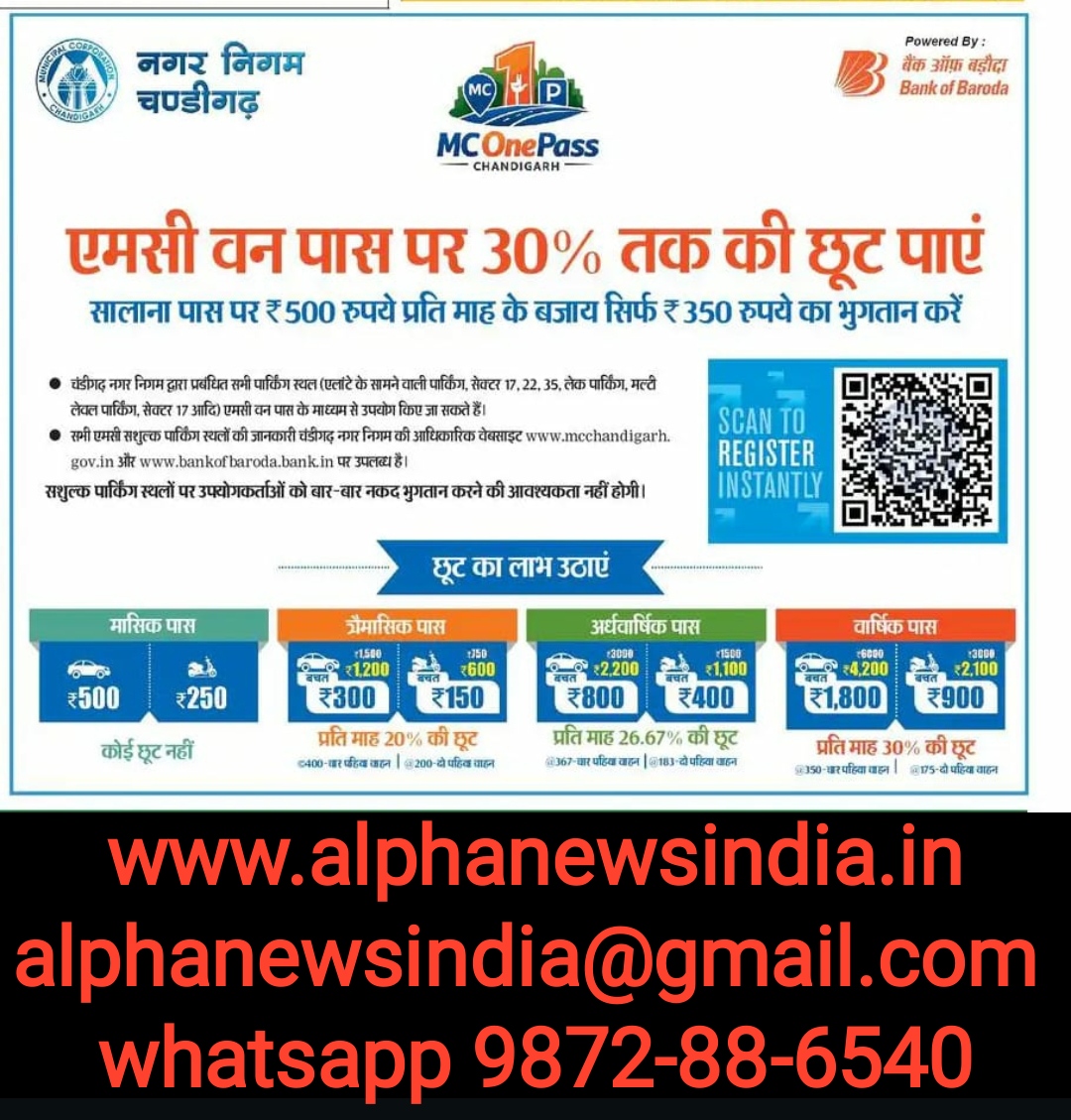 चंडीगढ रविवार 15/03/2026 अल्फा न्यूज़ इंडिया --- चंडीगढ़ नगरनिगम ने अब अपने वन पास को 30%सस्ता कर दिया है। यह आकर्षक ऑफर सीमित समय के लिए है इसलिए जल्दी आओ जल्दी पाओ।। ऑफर इतनी सस्ती सरल और सहज है कि हर उपभोक्ता खुशी से प्राप्त कर लेगा इसी बात का विशेष ध्यान दिया गया है।।
