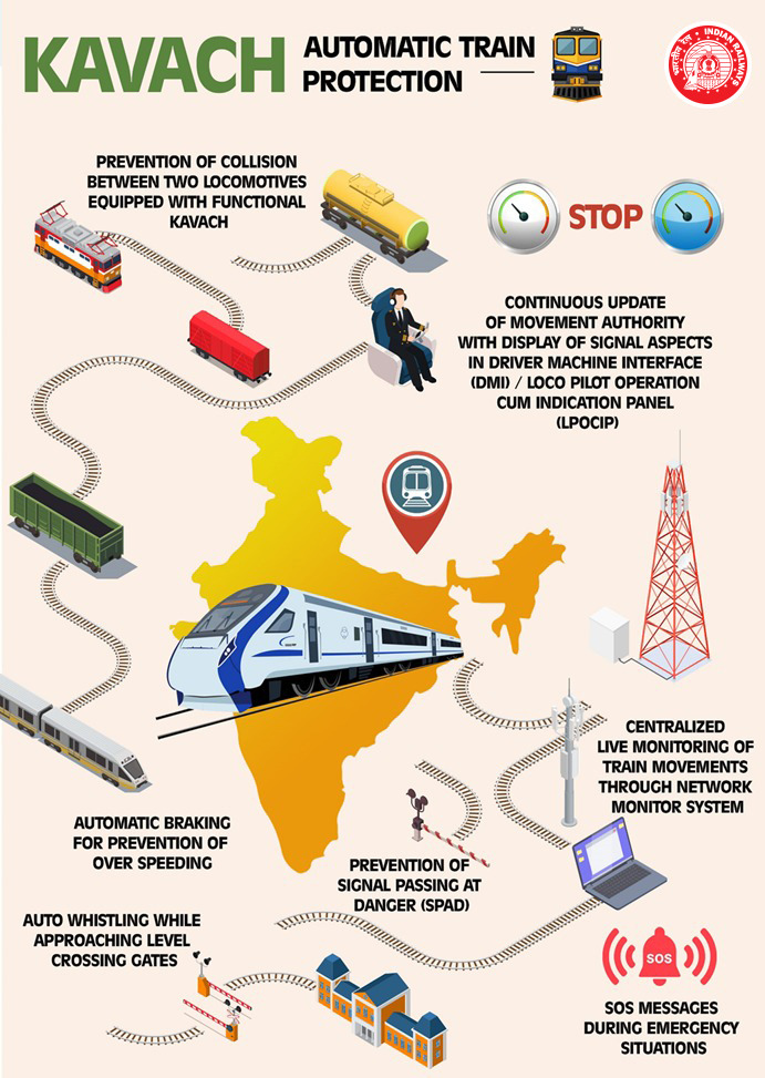 कवच भारत की स्वदेशी ऑटोमैटिक ट्रेन प्रोटेक्शन प्रणाली है, जिसे Research Designs and Standards Organisation ने विकसित किया है। इसका उद्देश्य रेलवे नेटवर्क पर “शून्य दुर्घटना” के लक्ष्य को हासिल करना है।