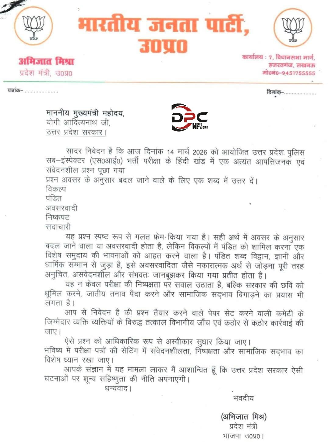 लखनऊ भाजपा में बड़ा बवाल,उत्तर प्रदेश में दरोगा भर्ती परीक्षा में पंडित को अवसरवादिता के विकल्प से जोड़ने पर बीजेपी में छिड़ा संग्राम.