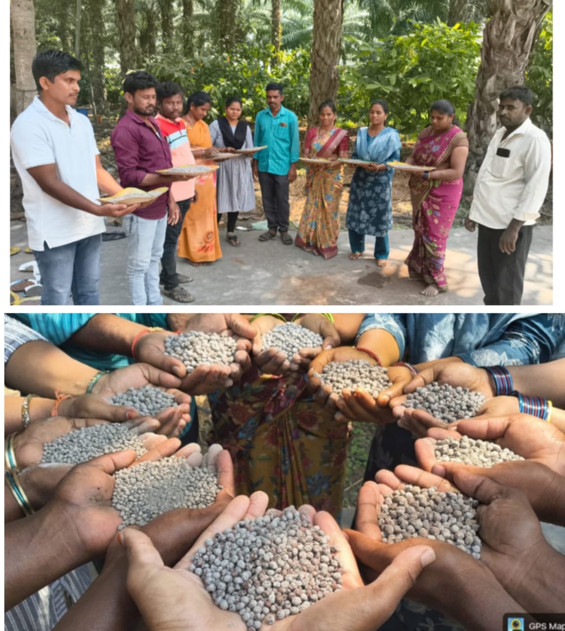 పార్వతీపురం మన్యం జిల్లా, సాలూరు మండలం, మామిడిపల్లి గ్రామంలో విత్తన గుళికలు ప్రకృతి వ్యవసాయ సిబ్బంది రైతులు సమక్షంలో తయారీ చేశారు. గుళికలు తయారీకి కావలసిన పదార్ధాలు బిజామృతం, బంకమట్టి పొడి, ఘన జీవామృతం పొడి, బూడిద మొదట గోనె సంచిలో విత్తనాలు తీసుకుని ఈ పదార్ధాలు విత్తనాలు 3 నుండి 5 రెట్లు అయ్యేంత వరకు కలపాలి అని అప్పుడు విత్తన గుళికలు తయారీ అవుతాయని ఈ విత్తన గుళికలు వలన ఉపయోగాలు ఏమిటంటే విత్తనం ఆరు నెలలు వరకు భూమి లో సురక్షితంగా ఉంటుంది. కలిగే ప్రతికూల వాతావరణ మార్పులను తట్టుకుంటుందని, సాధారణంగా విత్తనాలు కనీసం ఇరవై రెండు నుండి ఇరవై అయిదు మిల్లిమీటర్ల వర్షపాతం అవసరం కాని వేసవిలో పొడి నేలలో విత్తనాలు మొలకెత్తడానికి తగిన తేమను కలిగి ఉండవు విత్తన గుళికలు విధానం ద్వారా కనీసం పది నుండి పదిహేను మిల్లిమీటర్ల తేమకు కూడా మొలకెత్తుతాయని, నేల నుండి, గాలి నుండి, విత్తనం నుండి సంక్రమించే తెగుళ్లు ను తట్టుకుంటాయని పురుగులను ఎదుర్కొనే సామర్ధ్యాన్ని కలిగి ఉంటాయి అని ప్రకృతి వ్యవసాయ సిబ్బంది విత్తన గుళికలు తయారీ చేసి రైతులకు చూపించి విత్తన గుళికల ఉపయోగాలు తెలిపారు. ఈ కార్యక్రమంలో ప్రకృతి వ్యవసాయ సిబ్బంది రైతులు హాజరయ్యారు .
