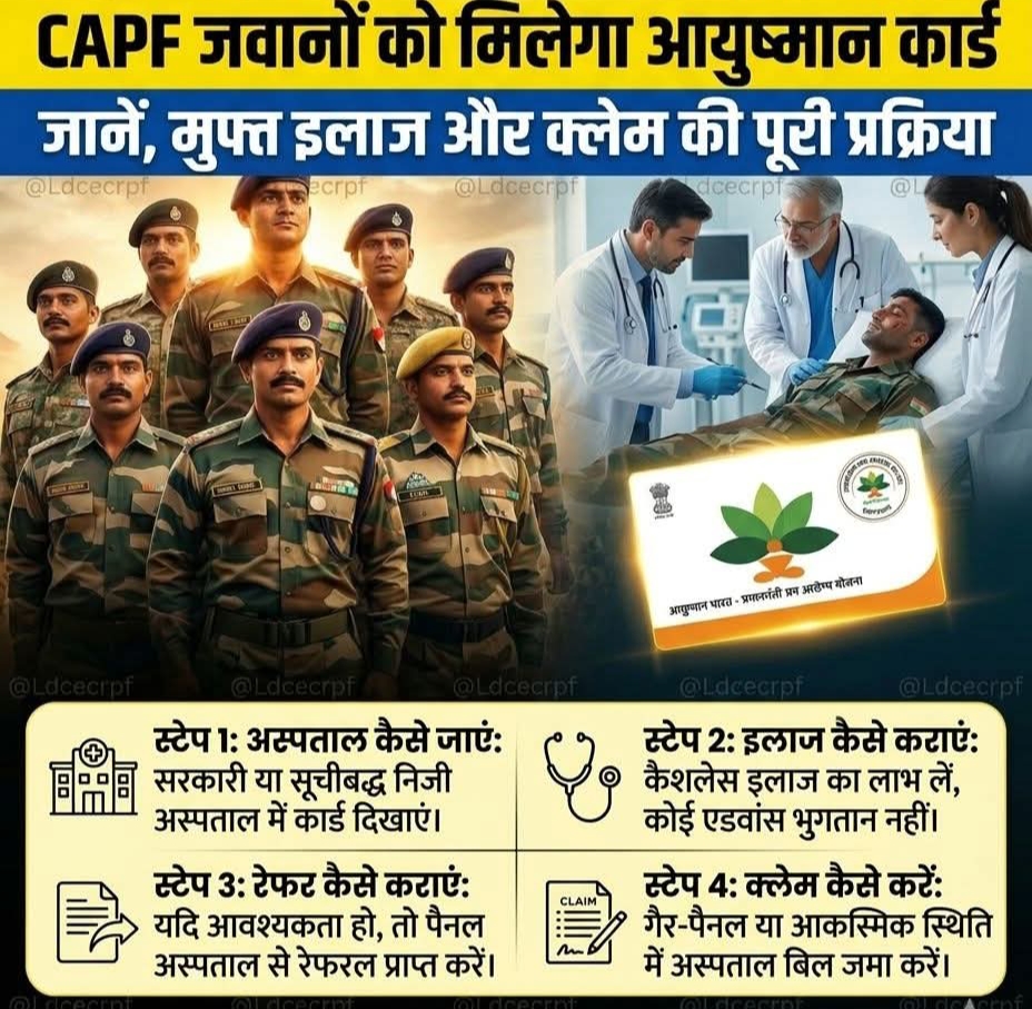 рджреЗрд╢ рдХреА рд╕реБрд░рдХреНрд╖рд╛ рдореЗрдВ рджрд┐рди-рд░рд╛рдд рддреИрдирд╛рдд рд░рд╣рдиреЗ рд╡рд╛рд▓реЗ CAPF (Central Armed Police Forces) рдХреЗ рдЬрд╡рд╛рдиреЛрдВ рдХреЗ рд▓рд┐рдП рдПрдХ рдмрдбрд╝реА рд░рд╛рд╣рдд рднрд░реА рдЦрдмрд░ рд╕рд╛рдордиреЗ рдЖрдИ рд╣реИред рд╕рд░рдХрд╛рд░ рдиреЗ рдлреИрд╕рд▓рд╛ рд▓рд┐рдпрд╛ рд╣реИ рдХрд┐ рдЕрдм CAPF рдХреЗ рдЬрд╡рд╛рдиреЛрдВ рдФрд░ рдЙрдирдХреЗ рдкрд░рд┐рд╡рд╛рд░реЛрдВ рдХреЛ рднреА рдЖрдпреБрд╖реНрдорд╛рди рднрд╛рд░рдд рдпреЛрдЬрдирд╛ рдХреЗ рддрд╣рдд рд╕реНрд╡рд╛рд╕реНрдереНрдп рд╕реБрд╡рд┐рдзрд╛ рдХрд╛ рд▓рд╛рдн рджрд┐рдпрд╛ рдЬрд╛рдПрдЧрд╛ред рдЗрд╕ рдлреИрд╕рд▓реЗ рдХреЗ рдмрд╛рдж рд▓рд╛рдЦреЛрдВ рдЬрд╡рд╛рдиреЛрдВ рдФрд░ рдЙрдирдХреЗ рдкрд░рд┐рд╡рд╛рд░реЛрдВ рдХреЛ рдмреЗрд╣рддрд░ рдФрд░ рдореБрдлреНрдд рдЗрд▓рд╛рдЬ рдХреА рд╕реБрд╡рд┐рдзрд╛ рдорд┐рд▓ рд╕рдХреЗрдЧреАред