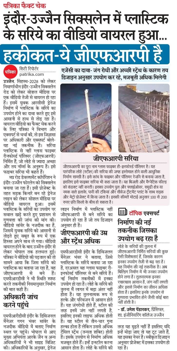 मामले की सच्चाई जानने के लिए Patrika Madhya Pradesh द्वारा किए गए फैक्ट-चेक में विभागीय अधिकारियों और विशेषज्ञों ने स्पष्ट किया कि निर्माण में प्लास्टिक नहीं, बल्कि ग्लास फाइबर रीइनफोर्स्ड पॉलिमर (GFRP) से बने आधुनिक फाइबर सरियों का उपयोग किया जा रहा है। यह उन्नत तकनीक के तहत प्रयुक्त सामग्री है, जो जंग-रोधी होने के साथ-साथ मजबूती और टिकाऊपन के मामले में पारंपरिक लोहे के सरियों की तुलना में बेहतर मानी जाती है और तथा निर्धारित तकनीकी मानकों के अनुरूप है।