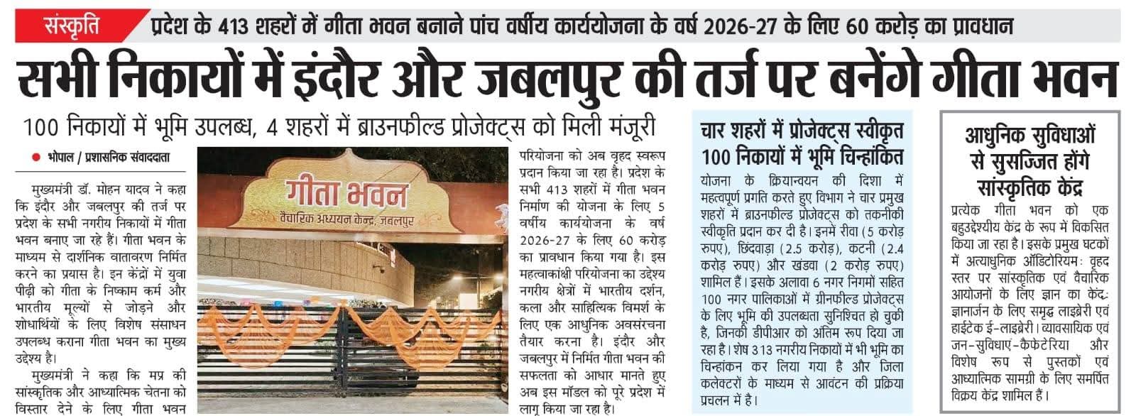 मध्यप्रदेश के सभी नगरीय निकायों में बनेंगे 'गीता भवन ' : मुख्यमंत्री डॉ. मोहन यादव