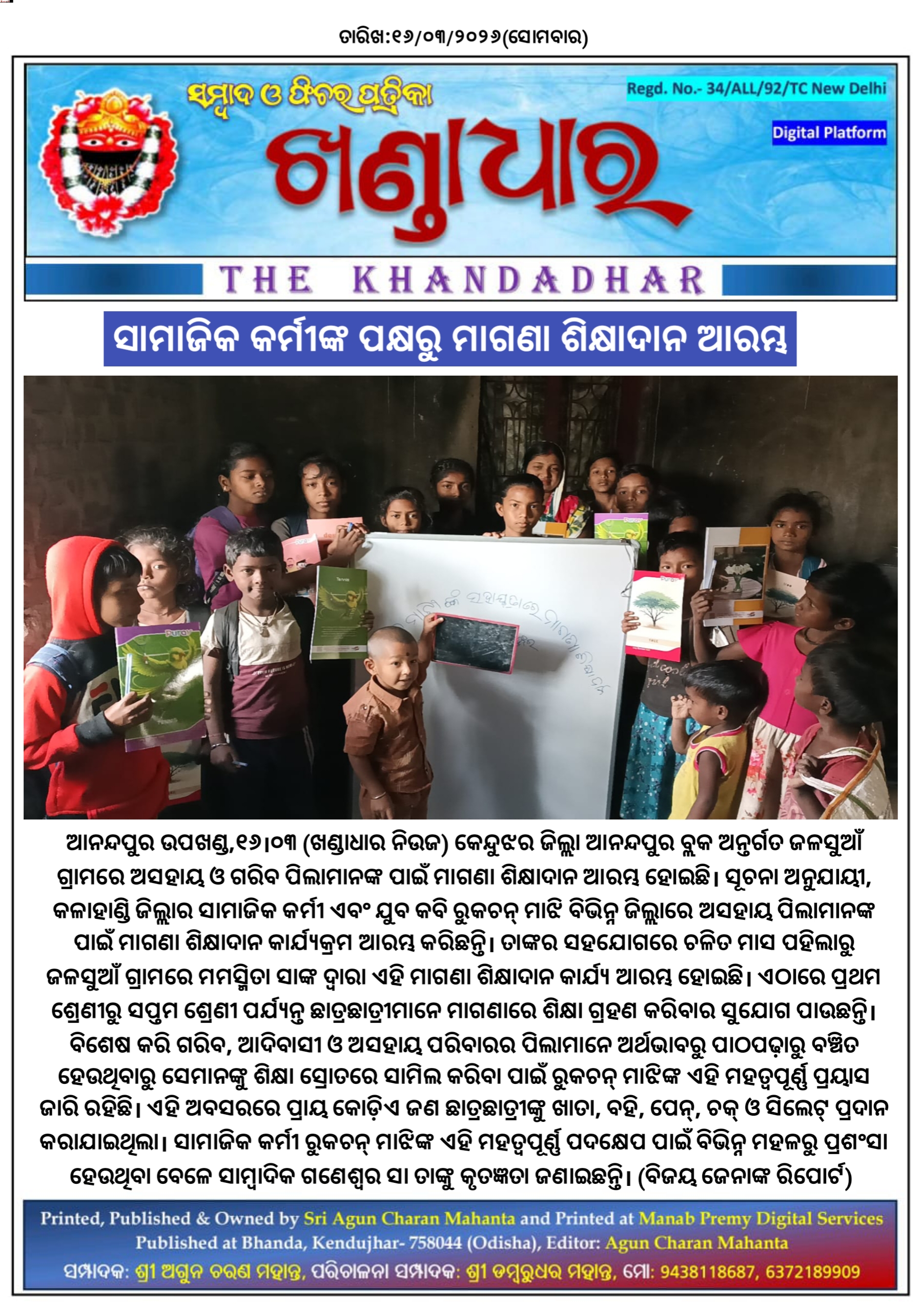 ସାମାଜିକ କର୍ମୀଙ୍କ ପକ୍ଷରୁ ମାଗଣା ଶିକ୍ଷାଦାନ ଆରମ୍ଭ।