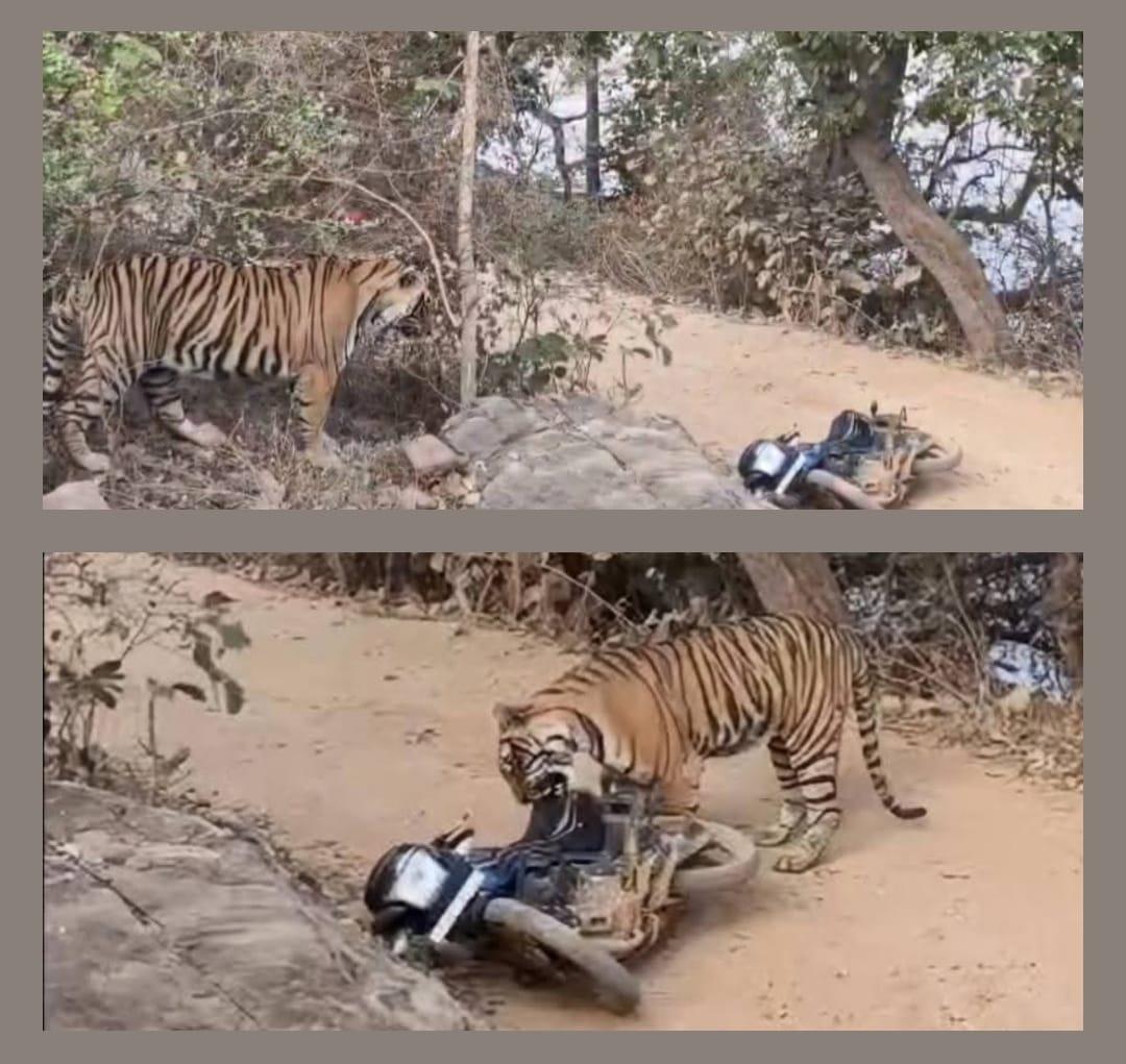 *टाईगर के हमला करने से पहले ही वन कर्मियों ने अपनी सरकारी बाईक को मौके पर छोड़कर अपनी जान बचाई*