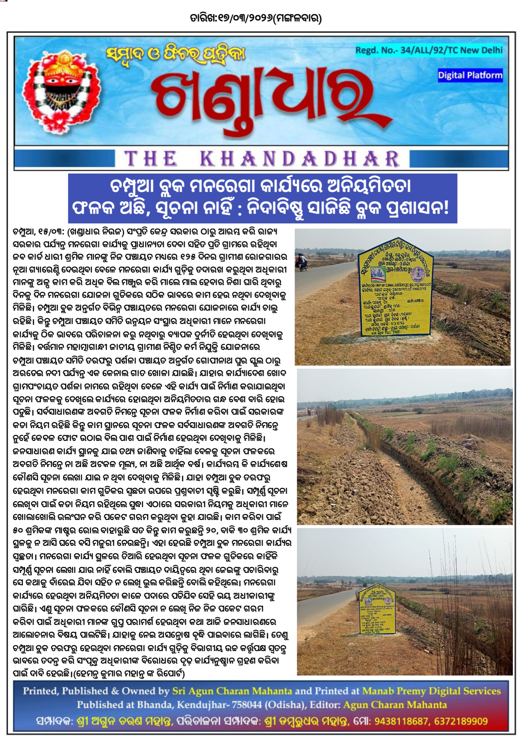 ଚମ୍ପୁଆ ବ୍ଲକ ମନରେଗା କାର୍ଯ୍ୟରେ ଅନିୟମିତତା ଫଳକ ଅଛି, ସୂଚନା ନାହିଁ : ନିଦାବିଷ୍ଣୁ ସାଜିଛି ବ୍ଳକ ପ୍ରଶାସନ !