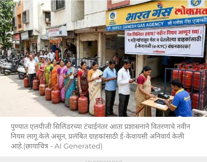 ९ महिन्यांहून अधिक काळ सिलिंडर न घेतलेल्या ग्राहकांसाठी ई-केवायसी (e-KYC) बंधनकारक.पुणे : एलपीजी सिलिंडर टंचाईमुळे वितरकांच्या कार्यालयांबाहेर नागरिकांच्या लांबचलांब रांगा दिसून येत आहेत. आता जिल्हा प्रशासनाने चार दिवसांत घरपोच सिलिंडरचे वितरण करण्याचे निर्देश गॅस कंपन्या आणि वितरकांना दिले आहेत. मात्र, अनेक ग्राहकांनी रिकामा सिलिंडर नसतानाही नोंदणी केल्यामुळे त्यांना पुरवठा कसा करणार, असा प्रश्न एलपीजी वितरकांसमोर निर्माण झाला आहे. याचवेळी ई-केवायसी काही ग्राहकांसाठी बंधनकारक करण्यात आला आहे.