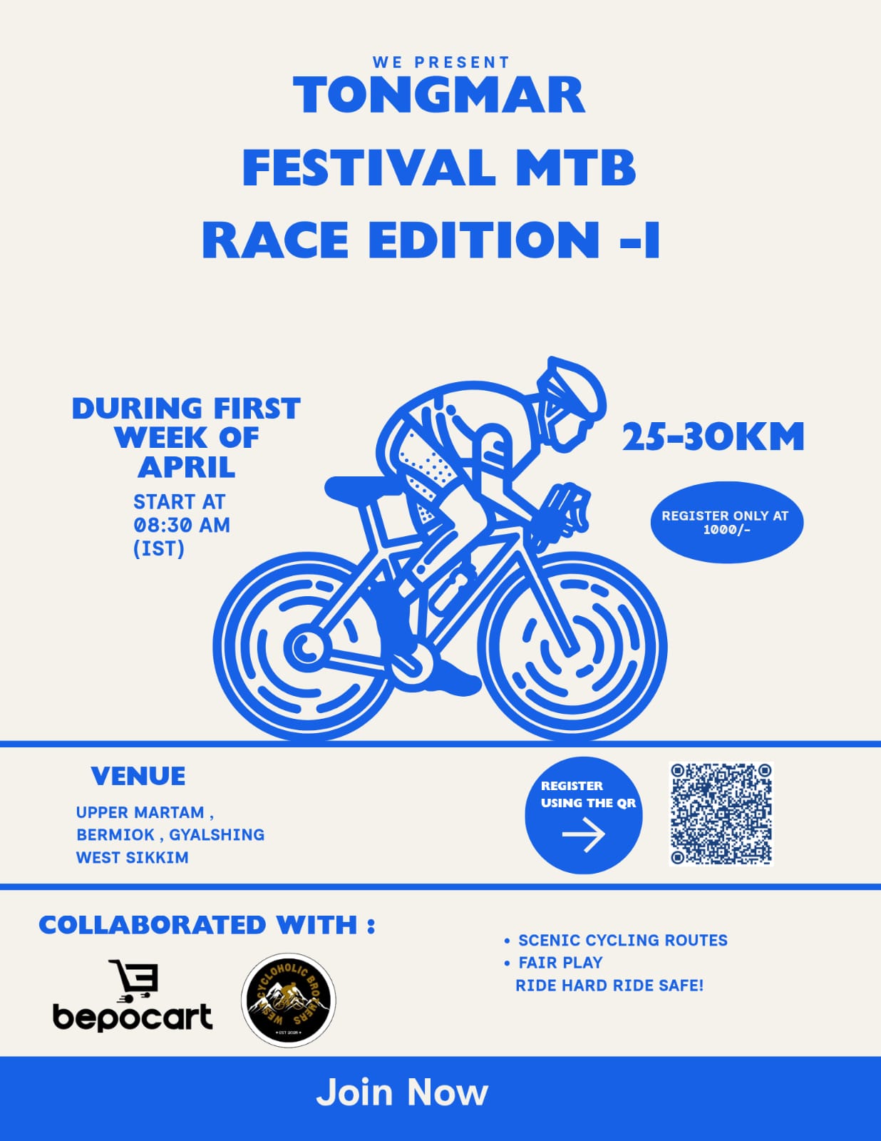Organizers के अनुसार, इस MTB race की दूरी लगभग 25–30 किलोमीटर होगी, जिसमें participants को West Sikkim के scenic और challenging pahadi routes पर ride करने का मौका मिलेगा। Event का venue Upper Martam, Bermiok, Gyalshing में रखा गया है।