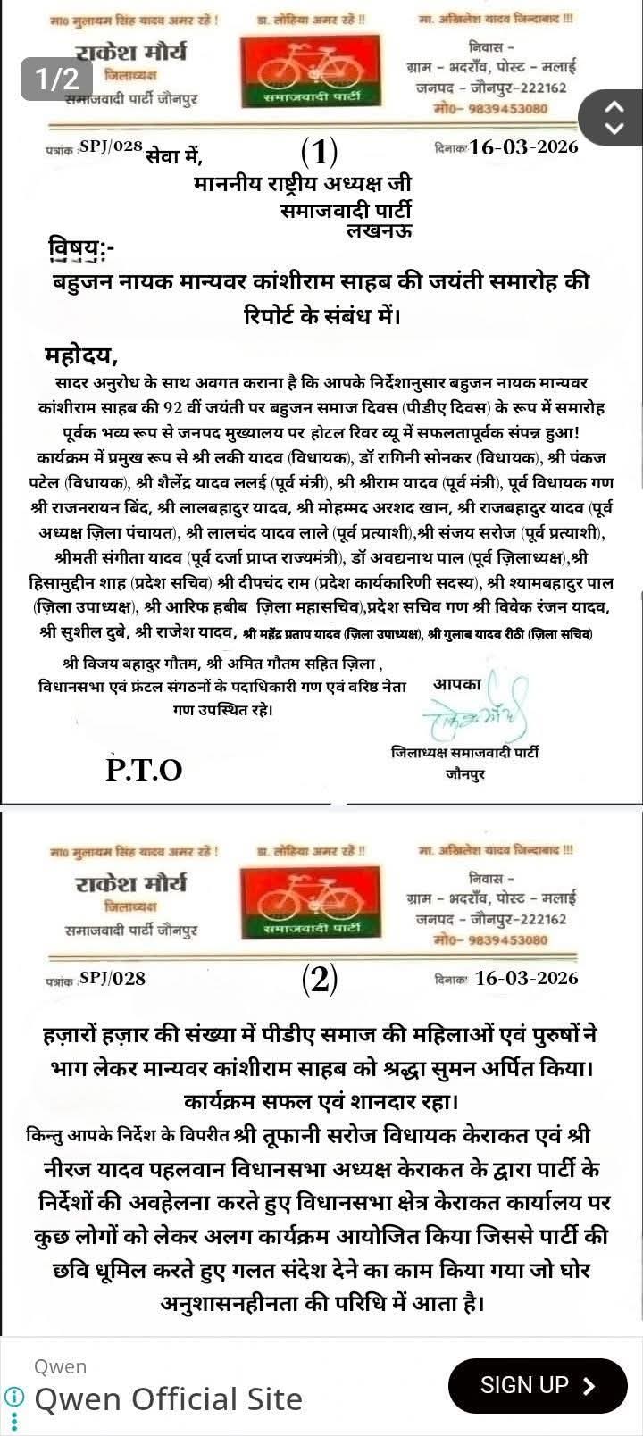 जौनपुर। समाजवादी पार्टी के जौनपुर जिलाध्यक्ष राकेश मौर्य ने पार्टी के राष्ट्रीय अध्यक्ष अखिलेश यादव को एक आधिकारिक पत्र भेजकर जनपद में आयोजित 'बहुजन नायक मान्यवर कांशीराम साहब' की जयंती समारोह की रिपोर्ट सौंपी है। इस रिपोर्ट में जहाँ एक ओर कार्यक्रम की सफलता का जिक्र है, वहीं दूसरी ओर केराकत विधायक और विधानसभा अध्यक्ष पर पार्टी निर्देशों की अवहेलना का गंभीर आरोप लगाया गया है।
