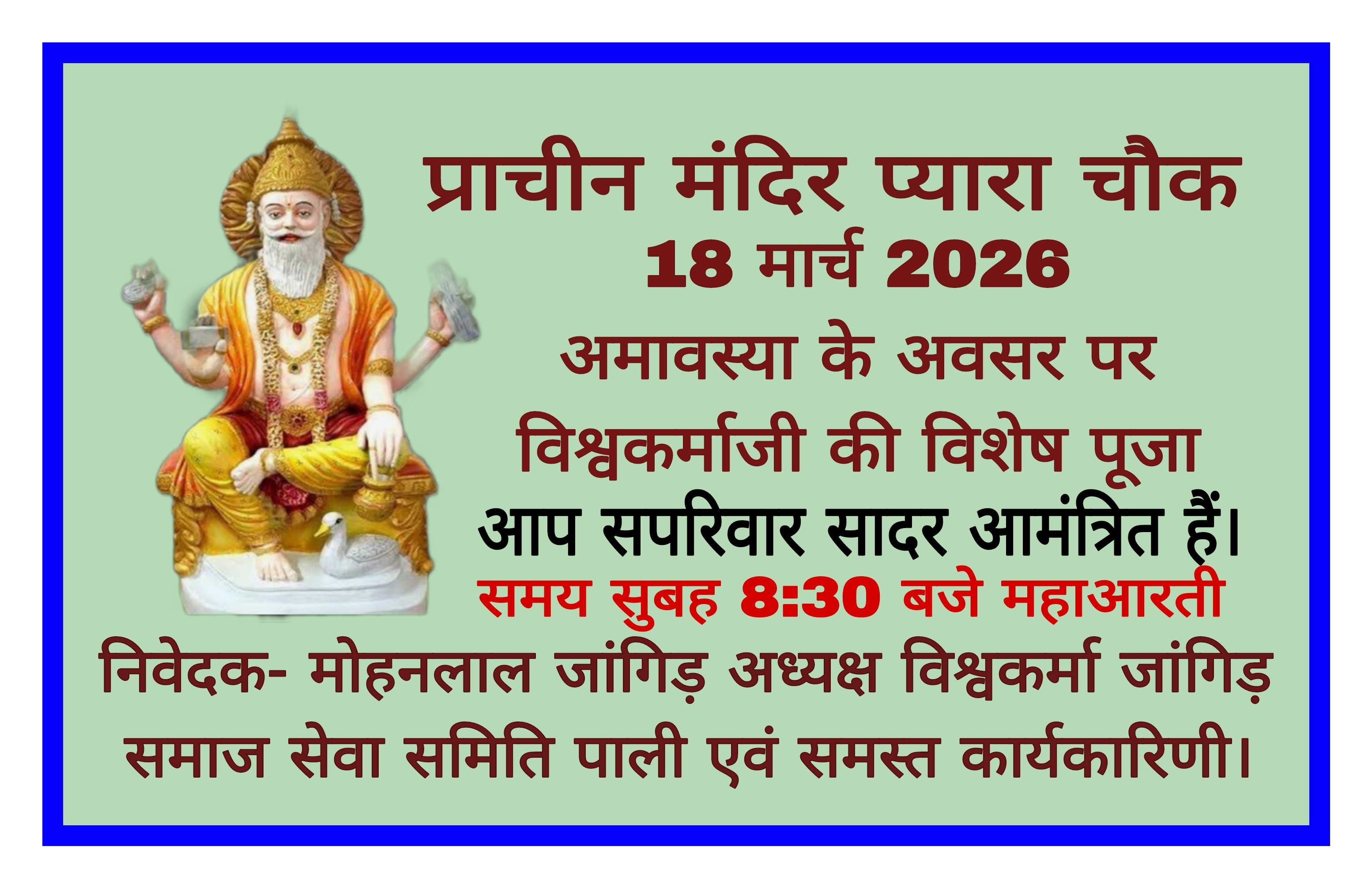 श्री विश्वकर्मा जांगिड़ समाज सेवा समिति पाली अध्यक्ष मोहनलाल जांगिड़ के नेतृत्व में समाज बंधु विशेष पूजा अर्चना करके सृष्टि रचयिता भगवान श्री विश्वकर्मा से समाज के एकीकरण एवं सबके सुखद भविष्य की प्रार्थना करेंगे।