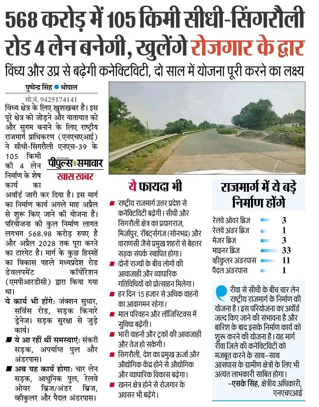 568 करोड़ में 105 किमी सीधी -सिंगरौली रोड 4 लेन बनेगी, खुलेंगे रोजगार के द्वार