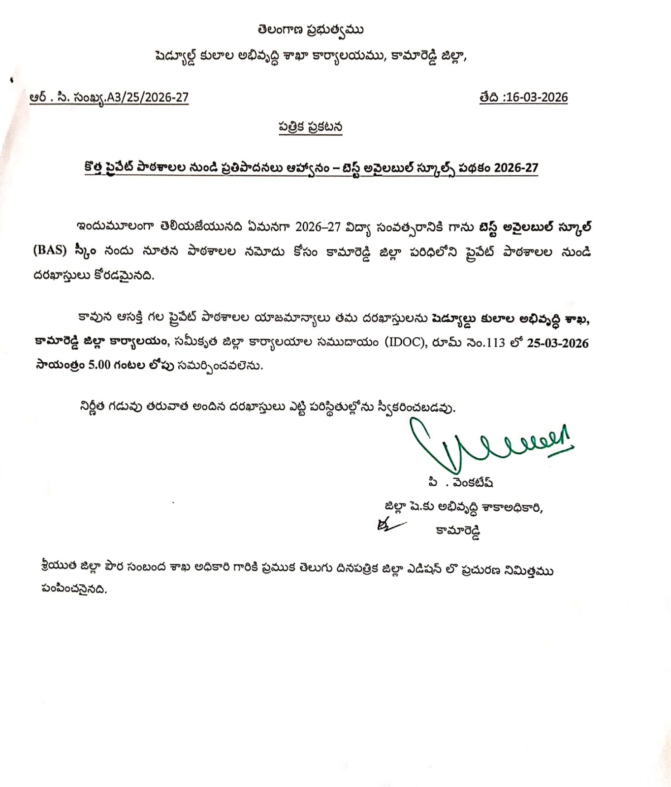2026- 27 విద్యా సంవత్సరానికి గాను బెస్ట్ అవైలబుల్ స్కూల్స్(BAS) స్కీం నందు నూతన పాఠశాలల నమోదు కోసం కామారెడ్డి జిల్లా పరిధిలోని ప్రైవేటు పాఠశాలల నుండి దరఖాస్తులు కోరడమైనది.