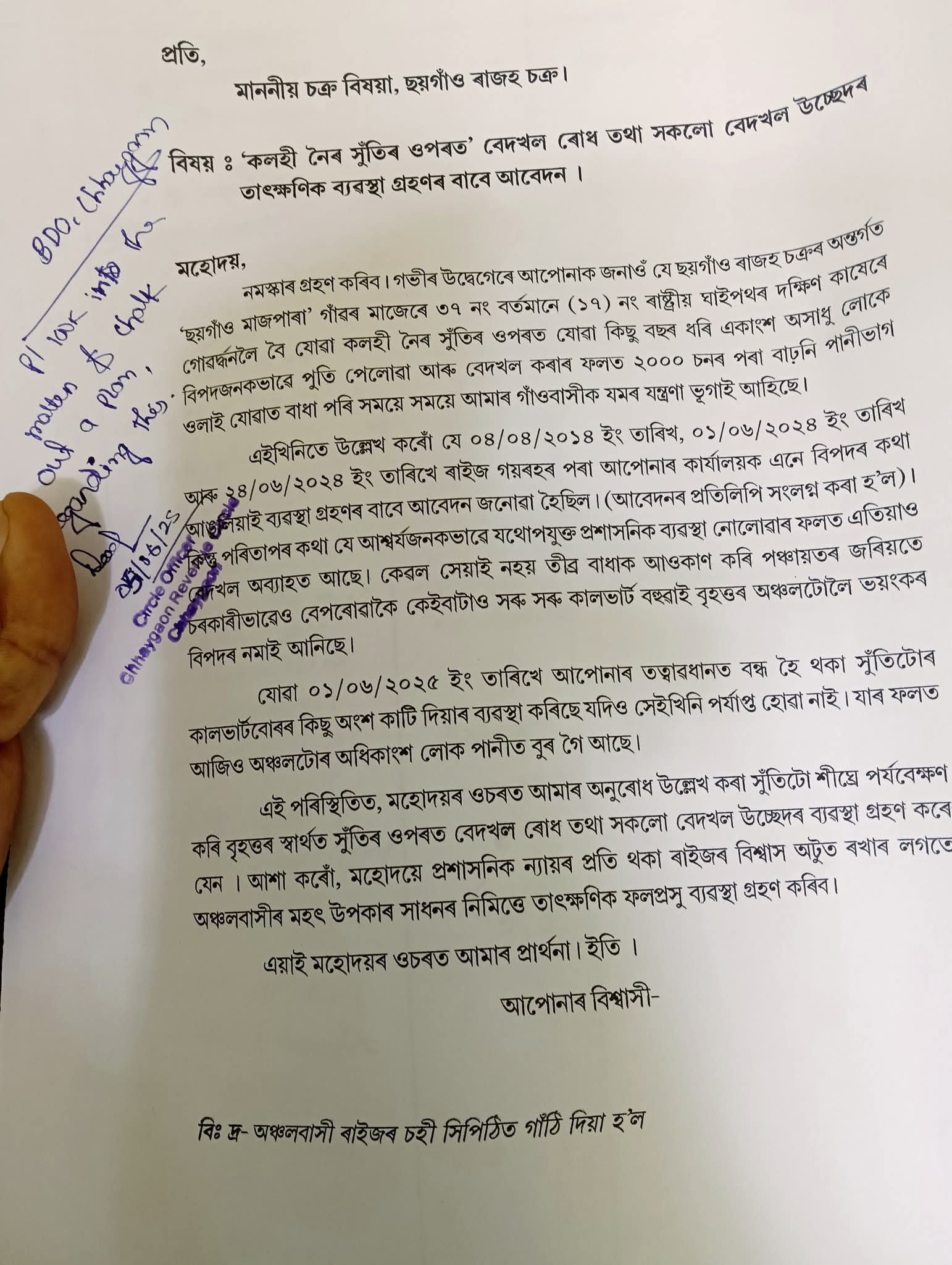 ১৮ মাৰ্চ, ২০২৬ :: দক্ষিণ কামৰূপৰ অন্তৰ্গত কলহী সুঁতিৰ ওপৰত থকা চৰকাৰী বেচৰকাৰী সকলো বেদখল অনতিবিলম্বে উচ্ছেদ কৰাৰ দাবী জনাইছে স্থানীয় সচেতন ৰাইজে। এই সম্পৰ্কত একাধিকবাৰ অঞ্চলটোৰ সচেতন ৰাইজে স্থানীয় সংশ্লিষ্ট কৰ্তৃপক্ষৰ ওচৰত আৱেদন জনাই আহিছে যদিও ফলাফল শূন্য। ৰাইজে অভিযোগ কৰিছে যে শেহতীয়াকৈ ছয়গাঁৱৰ দক্ষিণ অংশৰ মাজপাৰা, শিংখাট, নোৱামাটিকে ধৰি কেইবাখনো গাঁৱৰ বাসিন্দাৰ বাবে বিপদৰ সম্ভাৱনা বৃদ্ধি কৰি তথাকথিত উন্নয়নৰ নামত ৰাষ্ট্ৰীয় ঘাইপথ উন্নয়ন দপ্তৰে "ছয়গাঁও মাজপাৰা"ৰ বুকুৱেদি ১৭ নং ৰাষ্ট্ৰীয় ঘাইপথৰ দাঁতিৰে পশ্চিমলৈ বৈ যোৱা কলহীৰ সুঁতিটো মাজপাৰা-ঔগুৰিপথত মাটিৰে পুতি স্বৈৰাচাৰিতাৰ নিদৰ্শন দাঙি ধৰিছে। স্থানীয় প্ৰশাসনেও চকুমুদা কুলিৰ ভাও জুৰিছে। স্থানীয় জনপ্ৰতিনিধি সকলৰ ভূমিকাও সন্দেহজনক।