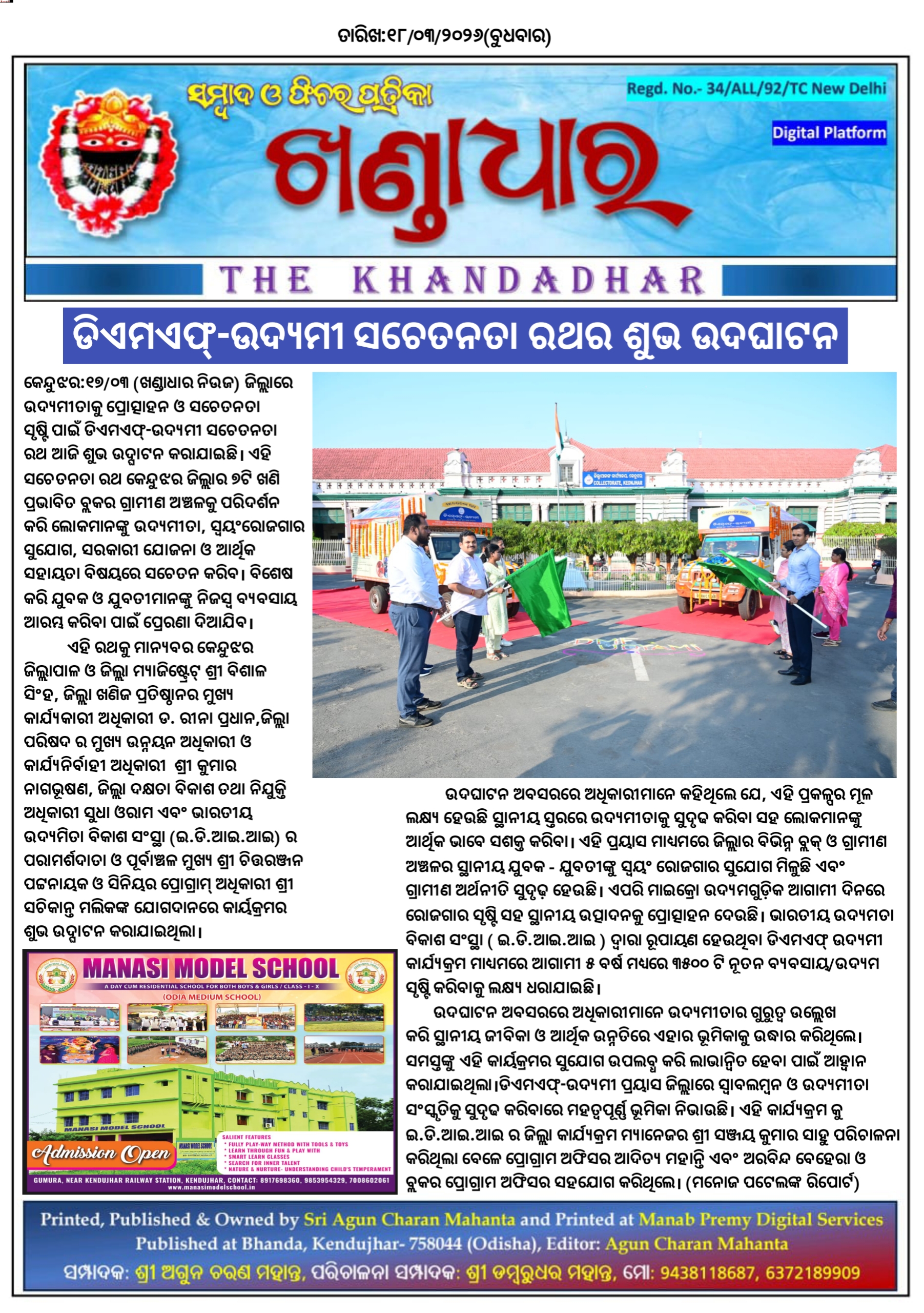 କେନ୍ଦୁଝର:୧୭/୦୩, ଜିଲ୍ଲାରେ ଉଦ୍ୟମୀତାକୁ ପ୍ରୋତ୍ସାହନ ଓ ସଚେତନତା ସୃଷ୍ଟି ପାଇଁ ଡିଏମଏଫ୍-ଉଦ୍ୟମୀ ସଚେତନତା ରଥ ଆଜି ଶୁଭ ଉଦ୍ଘାଟନ କରାଯାଇଛି।ଏହି ସଚେତନତା ରଥ କେନ୍ଦୁଝର ଜିଲ୍ଲାର ୭ଟି ଖଣି ପ୍ରଭାବିତ ବ୍ଲକର ଗ୍ରାମୀଣ ଅଞ୍ଚଳକୁ ପରିଦର୍ଶନ କରି ଲୋକମାନଙ୍କୁ ଉଦ୍ୟମୀତା, ସ୍ୱୟଂରୋଜଗାର ସୁଯୋଗ, ସରକାରୀ ଯୋଜନା ଓ ଆର୍ଥିକ ସହାୟତା ବିଷୟରେ ସଚେତନ କରିବ। ବିଶେଷ କରି ଯୁବକ ଓ ଯୁବତୀମାନଙ୍କୁ ନିଜସ୍ୱ ବ୍ୟବସାୟ ଆରମ୍ଭ କରିବା ପାଇଁ ପ୍ରେରଣା ଦିଆଯିବ। ଏହି ରଥକୁ ମାନ୍ୟବର କେନ୍ଦୁଝର ଜିଲ୍ଲାପାଳ ଓ ଜିଲ୍ଲା ମ୍ୟାଜିଷ୍ଟ୍ରେଟ୍ ଶ୍ରୀ ବିଶାଳ ସିଂହ, ଜିଲ୍ଲା ଖଣିଜ ପ୍ରତିଷ୍ଠାନର ମୁଖ୍ୟ କାର୍ଯ୍ୟକାରୀ ଅଧିକାରୀ ଡ. ରୀନା ପ୍ରଧାନ,ଜିଲ୍ଲା ପରିଷଦ ର ମୁଖ୍ୟ ଉନ୍ନୟନ ଅଧିକାରୀ ଓ କାର୍ଯ୍ୟନିର୍ବାହୀ ଅଧିକାରୀ ଶ୍ରୀ କୁମାର ନାଗଭୂଷଣ, ଜିଲ୍ଲା ଦକ୍ଷତା ବିକାଶ ତଥା ନିଯୁକ୍ତି ଅଧିକାରୀ ସୁଧା ଓରାମ ଏବଂ ଭାରତୀୟ ଉଦ୍ୟମିତା ବିକାଶ ସଂସ୍ଥା (ଇ.ଡି.ଆଇ.ଆଇ) ର ପରାମର୍ଶଦାତା ଓ ପୂର୍ବାଞ୍ଚଳ ମୁଖ୍ୟ ଶ୍ରୀ ଚିତ୍ତରଞ୍ଜନ ପଟ୍ଟନାୟକ ଓ ସିନିୟର ପ୍ରୋଗ୍ରାମ୍ ଅଧିକାରୀ ଶ୍ରୀ ସଚିକାନ୍ତ ମଲିକଙ୍କ ଯୋଗଦାନରେ କାର୍ୟକ୍ରମର ଶୁଭ ଉଦ୍ଘାଟନ କରାଯାଇଥିଲା।