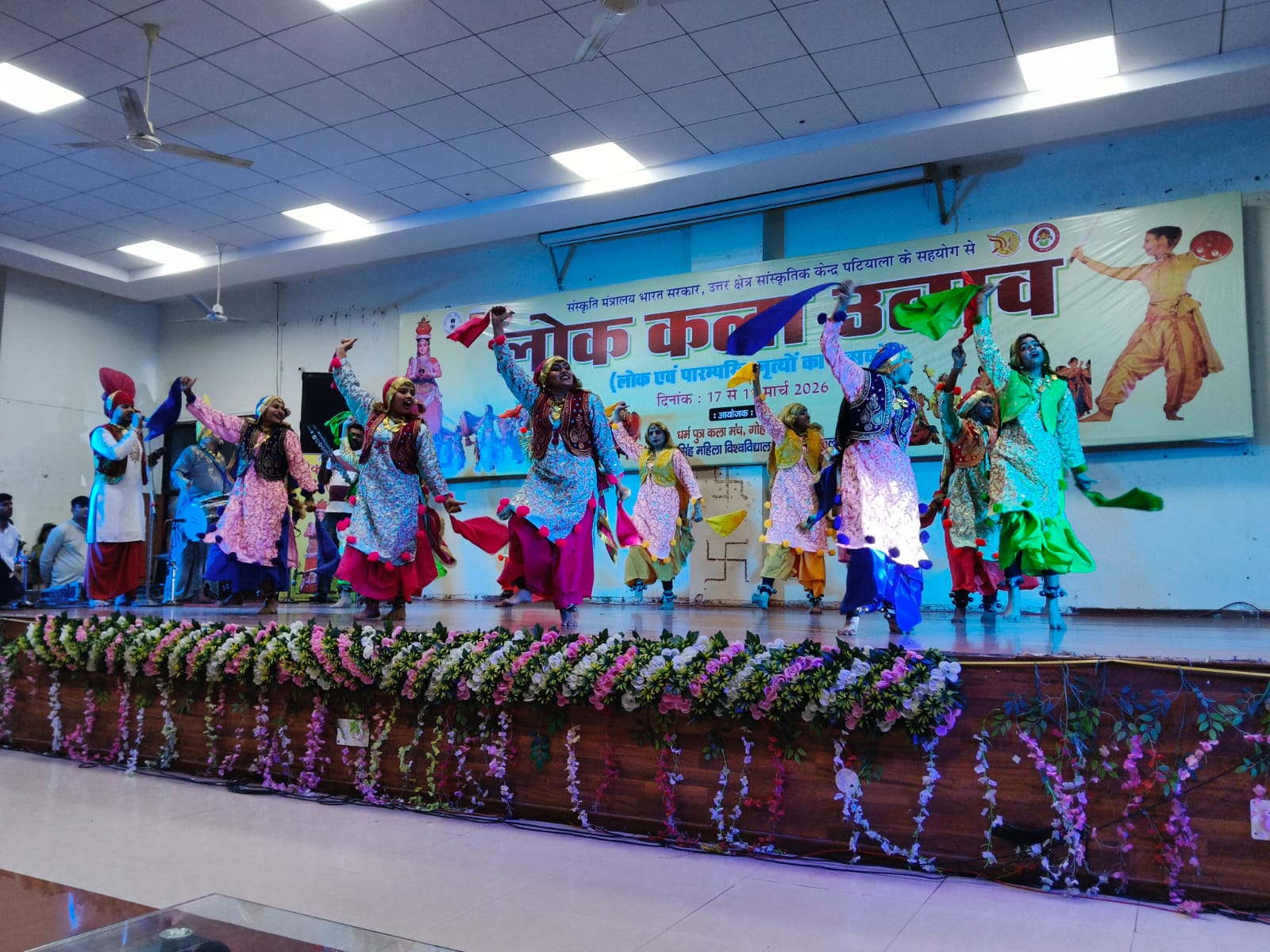 खानपुर कलां -18 मार्च। भगत फूल सिंह महिला विश्वविद्यालय में देर शाम से तीन दिवसीय “लोक कला उत्सव” का शुभारंभ अत्यंत भव्य और उत्साहपूर्ण वातावरण में हुआ। संस्कृति मंत्रालय भारत सरकार ,उत्तर क्षेत्र सांस्कृतिक केंद्र पटियाला के सहयोग से छात्र कल्याण अधिष्ठाता विभाग एवं धर्म पुत्र कला मंच के संयुक्त तत्वावधान में आयोजित इस उत्सव का उद्देश्य छात्राओं को भारतीय सांस्कृतिक विरासत से जोड़ना और विभिन्न राज्यों की लोक परंपराओं से परिचित कराना है।कार्यक्रम के उद्घाटन सत्र में बतौर मुख्य अतिथि विश्वविद्यालय की कुलपति प्रो. सुदेश रहीं, जिन्होंने दीप प्रज्ज्वलित कर उत्सव का विधिवत शुभारंभ किया। अपने संबोधन में उन्होंने कहा कि इस प्रकार के सांस्कृतिक आयोजन छात्राओं के समग्र विकास में महत्वपूर्ण भूमिका निभाते हैं। यह न केवल मनोरंजन का माध्यम हैं, बल्कि देश की समृद्ध सांस्कृतिक धरोहर को समझने और उसे संजोने का अवसर भी प्रदान करते हैं। उन्होंने कहा कि भारत की विविधता ही उसकी सबसे बड़ी शक्ति है और ऐसे आयोजनों से ‘एक भारत, श्रेष्ठ भारत’ की भावना को सुदृढ़ किया जा सकता है।उत्सव के उद्घाटन अवसर पर दिल्ली से आई नृत्य भूमि डांस फाउंडेशन समूह की कलाकारों ने भगवान शिव पर आधारित भरतनाट्यम की मनोहारी प्रस्तुति दी। नृत्य के माध्यम से पौराणिक और आध्यात्मिक कथाओं को जिस सजीवता और भाव-भंगिमाओं के साथ प्रस्तुत किया गया, उसने दर्शकों को मंत्रमुग्ध कर दिया। कलाकारों की अभिव्यक्ति, ताल-लय और मंच संयोजन ने कार्यक्रम को एक अलग ऊंचाई प्रदान की।उत्सव के अंतर्गत विभिन्न राज्यों से आई टीमों द्वारा लोक नृत्य एवं लोक गायन की रंगारंग प्रस्तुतियां दी जा रही हैं। पंजाब के लोक गीत, हरियाणा के पारंपरिक नृत्य, असम के बिहू, महाराष्ट्र के लावणी और राजस्थान के चरी नृत्य ने दर्शकों को देश की विविध सांस्कृतिक झलकियों से रूबरू कराया। प्रत्येक प्रस्तुति में कलाकारों ने अपनी क्षेत्रीय परंपराओं और लोक जीवन की झलक को बेहद आकर्षक ढंग से प्रस्तुत किया।धर्म पुत्र कलां मंच के अध्यक्ष मनोज जाले ने बताया कि तीन दिनों तक चलने वाले इस उत्सव में विभिन्न सांस्कृतिक प्रतियोगिताएं, लोक प्रस्तुतियां और पारंपरिक कलाओं का प्रदर्शन किया जाएगा, जिससे छात्राओं को अपनी प्रतिभा दिखाने के साथ-साथ भारतीय संस्कृति की गहराई को समझने का अवसर मिलेगा। जाले ने कहा कि कार्यक्रम के दौरान पूरे परिसर में सांस्कृतिक समरसता, उत्साह और सकारात्मक ऊर्जा का माहौल बना रहा।इस अवसर पर छात्र कल्याण अधिष्ठाता प्रो श्वेता सिंह , सह छात्र कल्याण अधिष्ठाता प्रो जगदीप सिंगला ,डॉ इशानी , डॉ मोनिका एवं बड़ी संख्या में छात्राएं उपस्थित रहीं। फोटो 