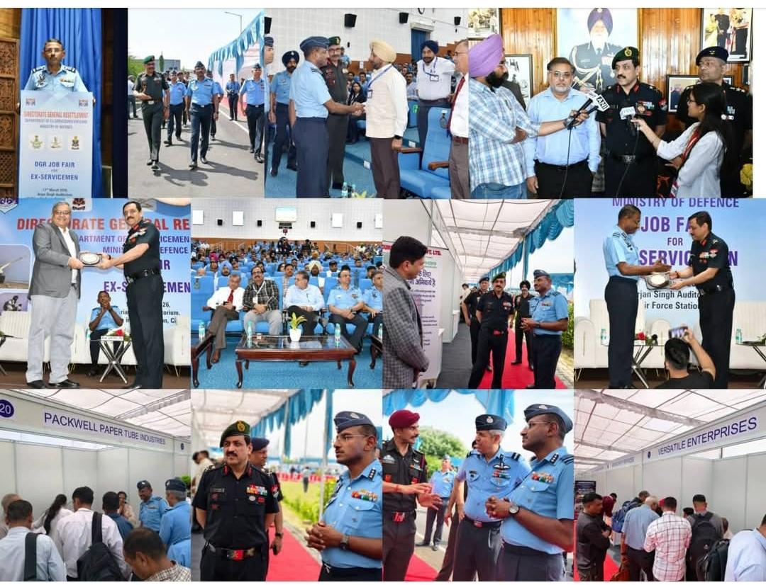 चंडीगढ़ बुधवार 18 मार्च 2026 आरके विक्रमा शर्मा अनिल शारदा हरीश शर्मा रक्षत शर्मा----: रक्षा मंत्रालय के अंतर्गत पूर्व सैनिक कल्याण विभाग (डीओईएसडब्लू) के तहत डायरेक्टोरेट जनरल रिसेटलमेंट (डीजीआर) ने 17 मार्च 2026 को 12 विंग एयरफोर्स स्टेशन, चंडीगढ़ स्थित अरजन सिंह ऑडिटोरियम में पूर्व सैनिकों (ESM) के लिए एक रोजगार मेले का आयोजन किया।