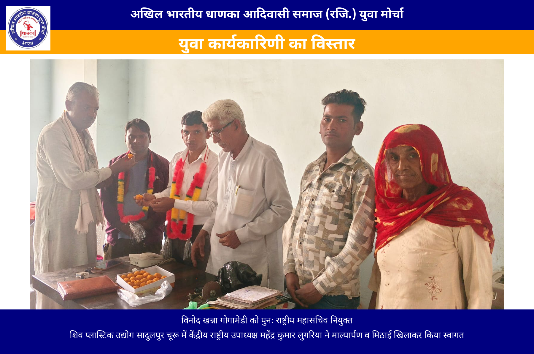 गोगामेड़ी। अखिल भारतीय धाणका आदिवासी समाज (रजि.) की युवा मोर्चा विंग को मजबूत करते हुए नवनियुक्त युवा मोर्चा राष्ट्रीय अध्यक्ष विनोद कुमार बागड़ी ने गोगामेड़ी के पत्रकार विनोद खन्ना धाणका को राष्ट्रीय महासचिव पद पर नियुक्त किया।